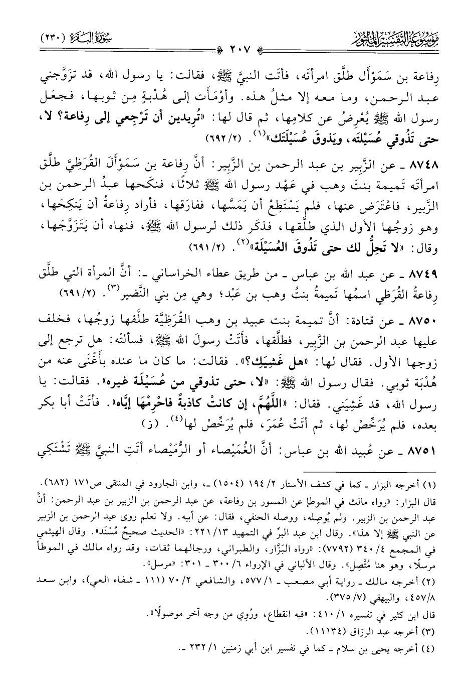 ٨٧٤٨ - عن الزَّبِير بن عبد الرحمن بن الزَّبِير: أنّ رِفاعة بن سَمَوْأَلَ القُرَظِيَّ طلَّق امرأتَه تَميمة بنتَ وهب في عَهْد رسول الله - صلى الله عليه وسلم - ثلاثًا، فنكَحها عبدُ الرحمن بن الزَّبير، فاعْتَرَض عنها، فلم يَسْتَطِعْ أن يَمَسَّها، ففارَقها، فأراد رِفاعةُ أن يَنكِحَها، وهو زوجُها الأول الذي طلَّقها، فذكَر ذلك لرسول الله - صلى الله عليه وسلم -، فنهاه أن يَتَزَوَّجَها، وقال: «لا تَحِلُّ لك حتى تَذُوقَ العُسَيْلَة» (¬٢). (٢/ ٦٩١)