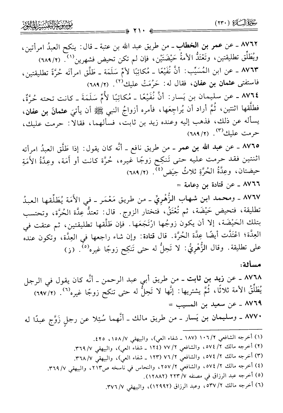 ٨٧٦٤ - عن سليمان بن يَسار: أنّ نُفَيْعًا -مُكاتِبًا لأُمِّ سَلَمَةَ- كانت تحته حُرَّةٌ، فطلَّقها اثنتين، ثُمَّ أراد أن يُراجِعَها، فأمره أزواجُ النبي - صلى الله عليه وسلم - أن يأتيَ عثمانَ بن عفان، يسأله عن ذلك، فذهب إليه وعنده زيد بن ثابت، فسألهما، فقالا: حرمت عليك، حرمت عليك (¬٣). (٢/ ٦٨٩)