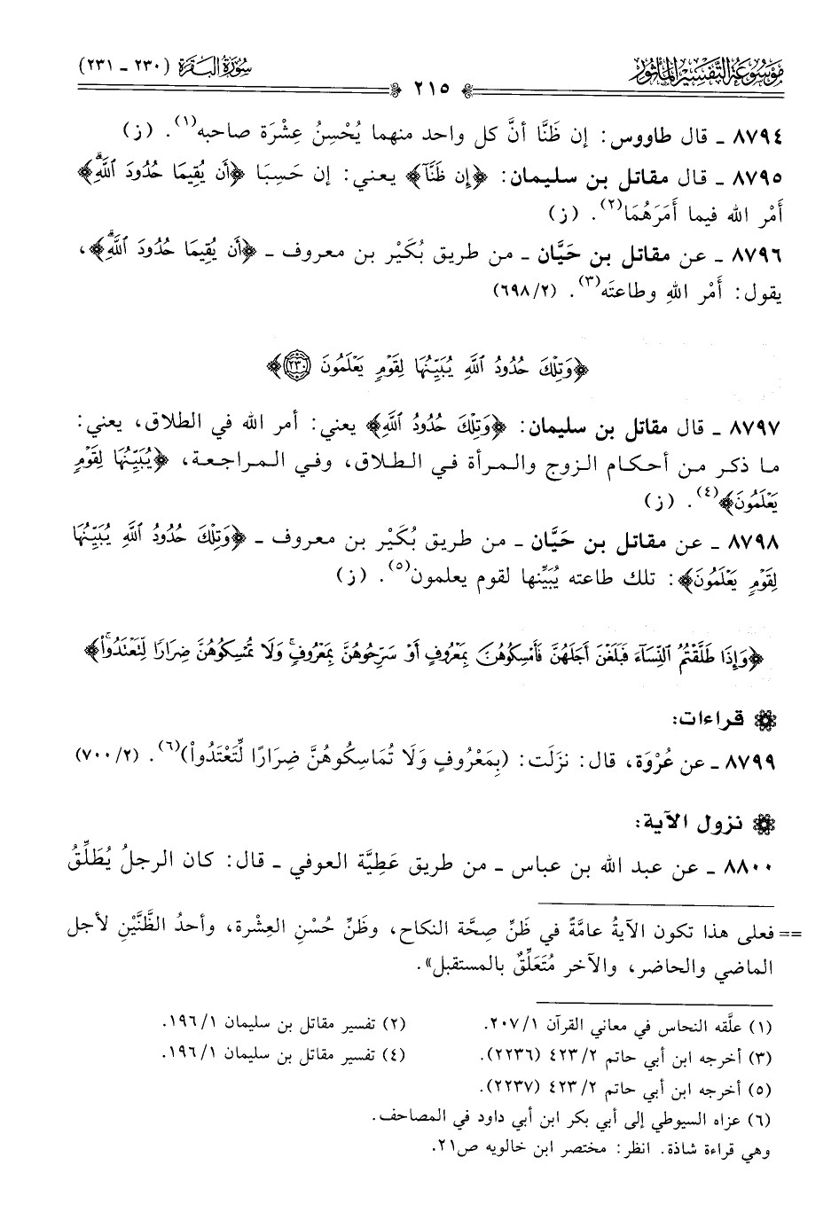 ٨٧٩٩ - عن عُرْوَة، قال: نزَلَت: (بِمَعْرُوفٍ ولا تُماسِكُوهُنَّ ضِرارًا لِّتَعْتَدُواْ) (¬٦). (٢/ ٧٠٠)