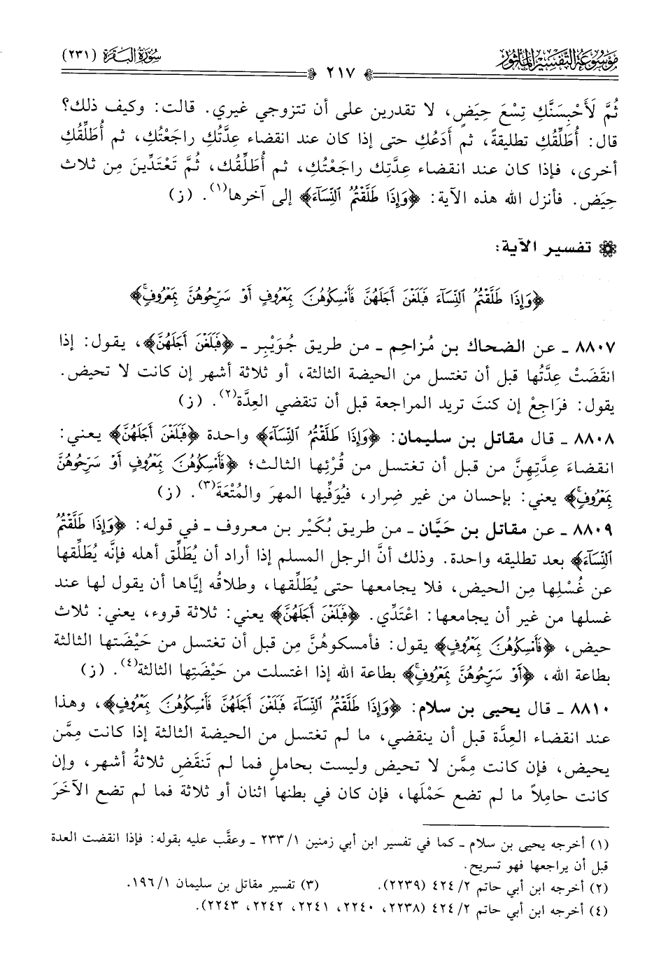 ٨٨٠٩ - عن مقاتل بن حَيّان -من طريق بُكَيْر بن معروف- في قوله: {وإذا طَلَّقْتُمُ النِّساءَ} بعد تطليقه واحدة. وذلك أنّ الرجل المسلم إذا أراد أن يُطَلِّق أهله فإنّه يُطَلِّقها عن غُسْلِها مِن الحيض، فلا يجامعها حتى يُطَلِّقها، وطلاقُه إيّاها أن يقول لها عند غسلها من غير أن يجامعها: اعْتَدِّي. {فَبَلَغْنَ أجَلَهُنَّ} يعني: ثلاثة قروء، يعني: ثلاث حيض، {فَأَمْسِكُوهُنَّ بِمَعْرُوفٍ} يقول: فأمسكوهُنَّ مِن قبل أن تغتسل من حَيْضَتها الثالثة بطاعة الله، {أوْ سَرِّحُوهُنَّ بِمَعْرُوفٍ} بطاعة الله إذا اغتسلت من حَيْضَتِها الثالثة (¬٤). (ز)