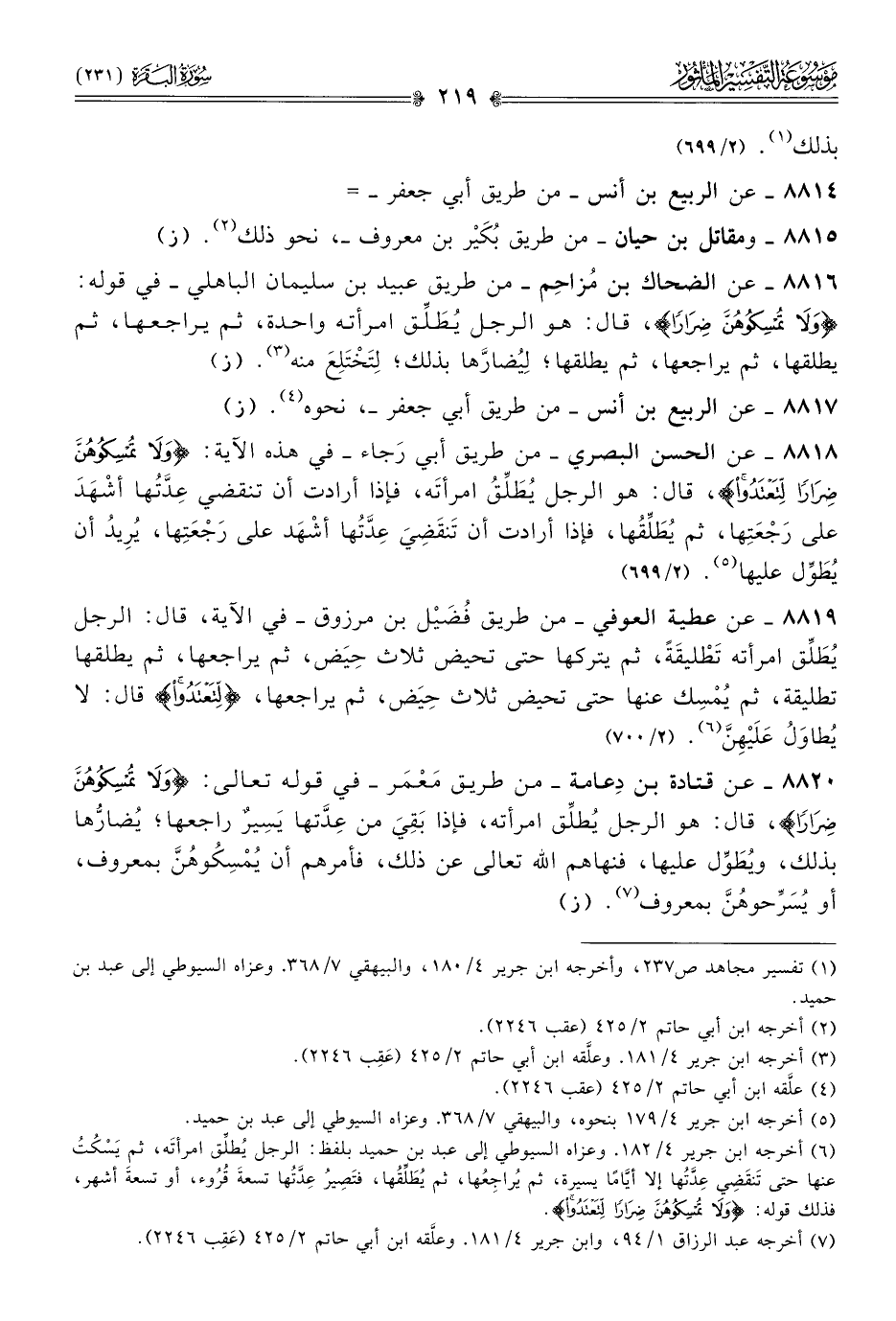 (¬٦) أخرجه ابن جرير ٤/ ١٨٢. وعزاه السيوطي إلى عبد بن حميد بلفظ: الرجل يُطلِّق امرأتَه، ثم يَسْكُتُ عنها حتى تَنقَضِي عِدَّتُها إلا أيّامًا يسيرة، ثم يُراجِعُها، ثم يُطَلِّقُها، فتَصِيرُ عِدَّتُها تسعةَ قُرُوء، أو تسعةَ أشهر، فذلك قوله: {ولا تمسكوهن ضرارا لتعتدوا}.
