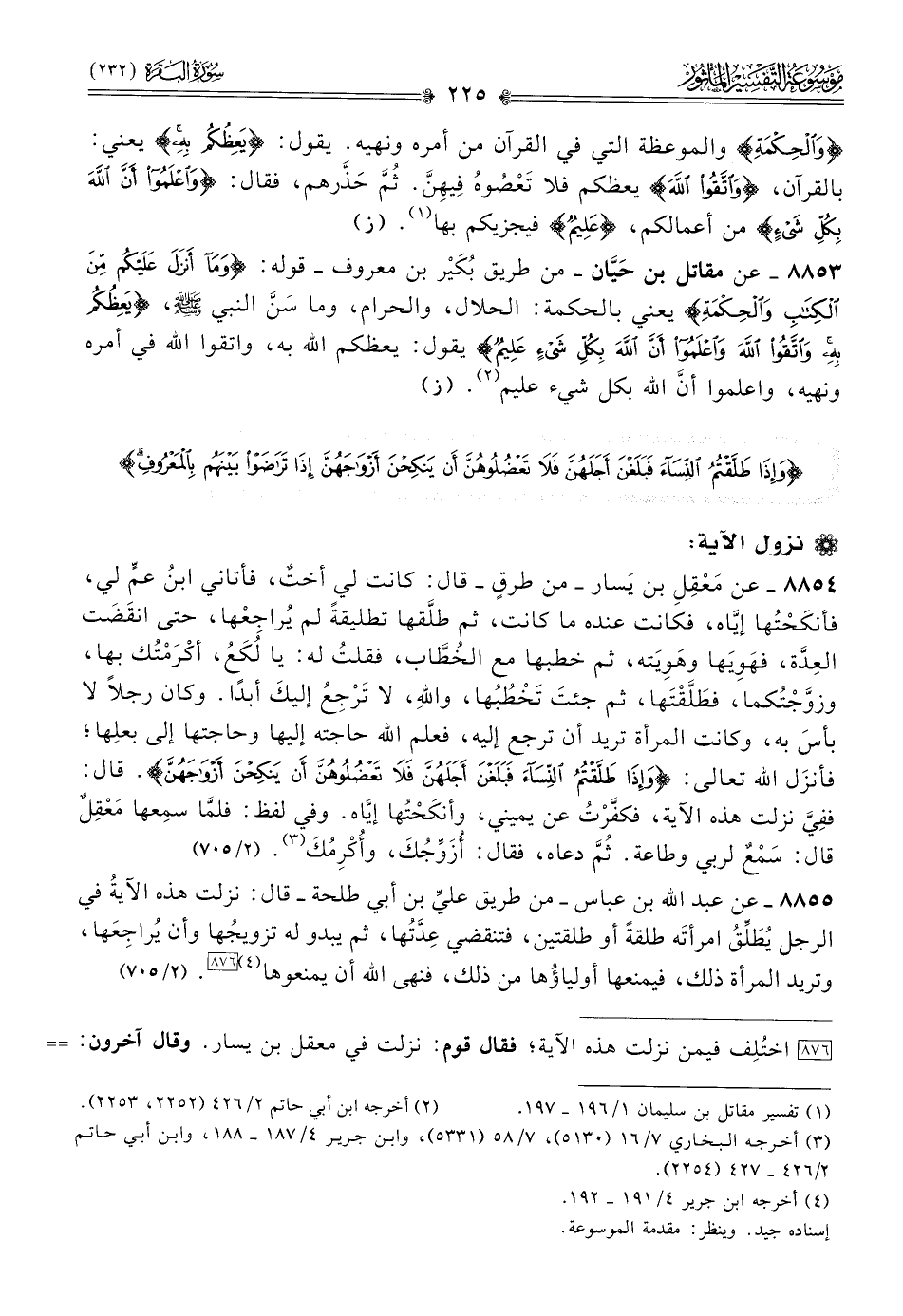 ٨٨٥٣ - عن مقاتل بن حَيّان -من طريق بُكَيْر بن معروف- قوله: {وما أنْزَلَ عَلَيْكُمْ مِنَ الكِتابِ والحِكْمَةِ} يعني بالحكمة: الحلال، والحرام، وما سَنَّ النبي - صلى الله عليه وسلم -، {يَعِظُكُمْ بِهِ واتَّقُوا اللَّهَ واعْلَمُوا أنَّ اللَّهَ بِكُلِّ شَيْءٍ عَلِيمٌ} يقول: يعظكم الله به، واتقوا الله في أمره ونهيه، واعلموا أنّ الله بكل شيء عليم (¬٢). (ز)