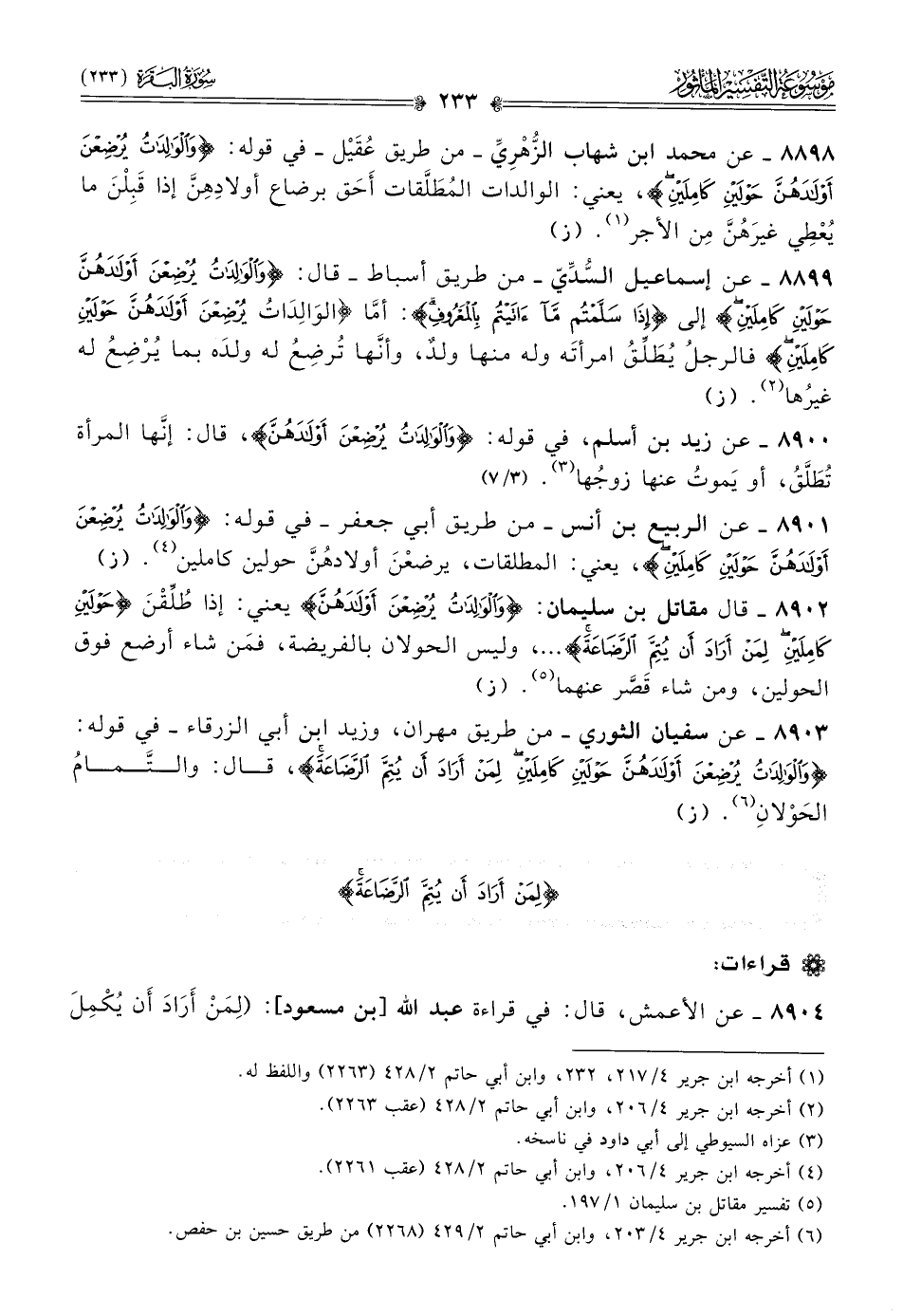 ٨٩٠٣ - عن سفيان الثوري -من طريق مهران، وزيد ابن أبي الزرقاء - في قوله: {والوالدات يرضعن أولادهن حولين كاملين لمن أراد أن يتم الرضاعة}، قال: والتَّمامُ الحَوْلانِ (¬٦). (ز)