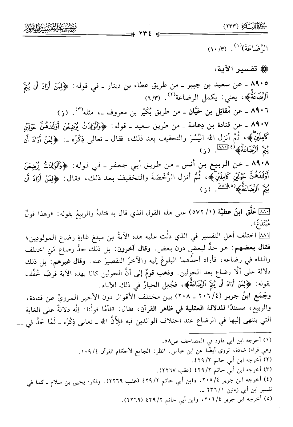 ٨٩٠٧ - عن قتادة بن دِعامة -من طريق سعيد- قوله: {والوالدات يرضعن أولادهن حولين كاملين}، ثُمَّ أنزل الله اليُسْرَ والتخفيف بعد ذلك، فقال -تعالى ذِكْرُه-: {لمن أراد أن يتم الرضاعة} (¬٤) [٨٨٠]. (ز)