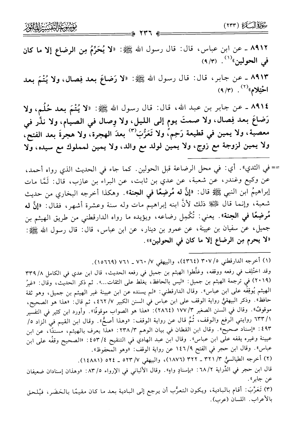 ٨٩١٢ - عن ابن عباس، قال: قال رسول الله - صلى الله عليه وسلم -: «لا يُحَرِّمُ مِن الرضاع إلا ما كان في الحولين» (¬١). (٣/ ٩)