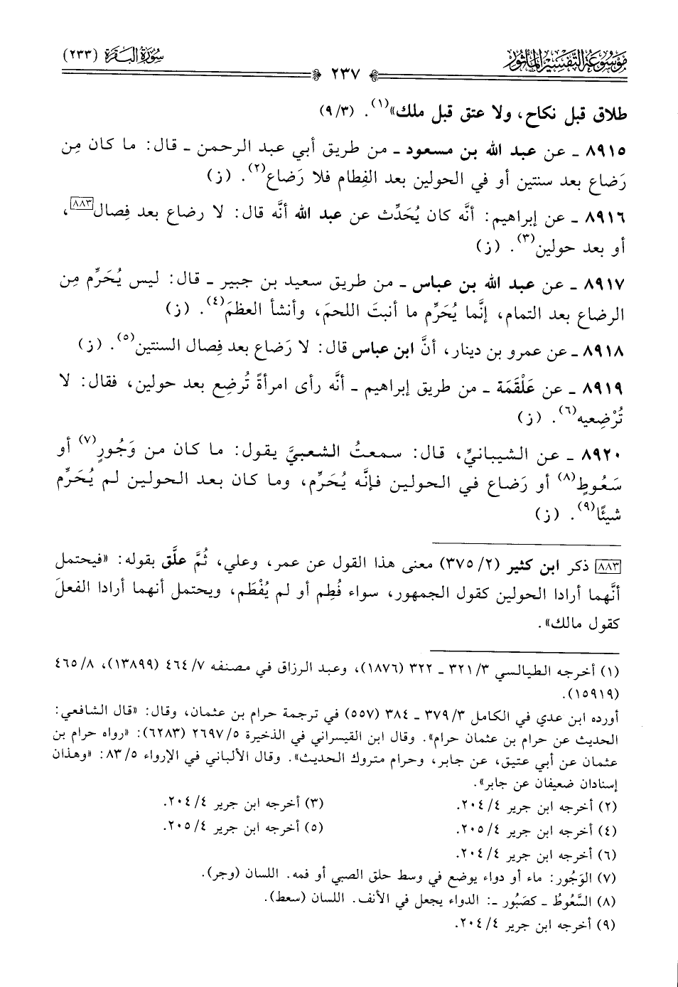 [٨٨٣] ذكر ابن كثير (٢/ ٣٧٥) معنى هذا القول عن عمر، وعلي، ثُمَّ علَّق بقوله: «فيحتمل أنّهما أرادا الحولين كقول الجمهور، سواء فُطِم أو لم يُفْطَم، ويحتمل أنهما أرادا الفعلَ كقول مالك».