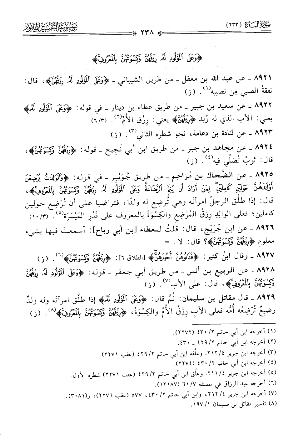 ٨٩٢٦ - عن ابن جُرَيْج، قال: قلتُ لعطاء [بن أبي رباح]: أسمعتَ فيها بشيء معلوم {رزقهن وكسوتهن}؟ قال: لا. =