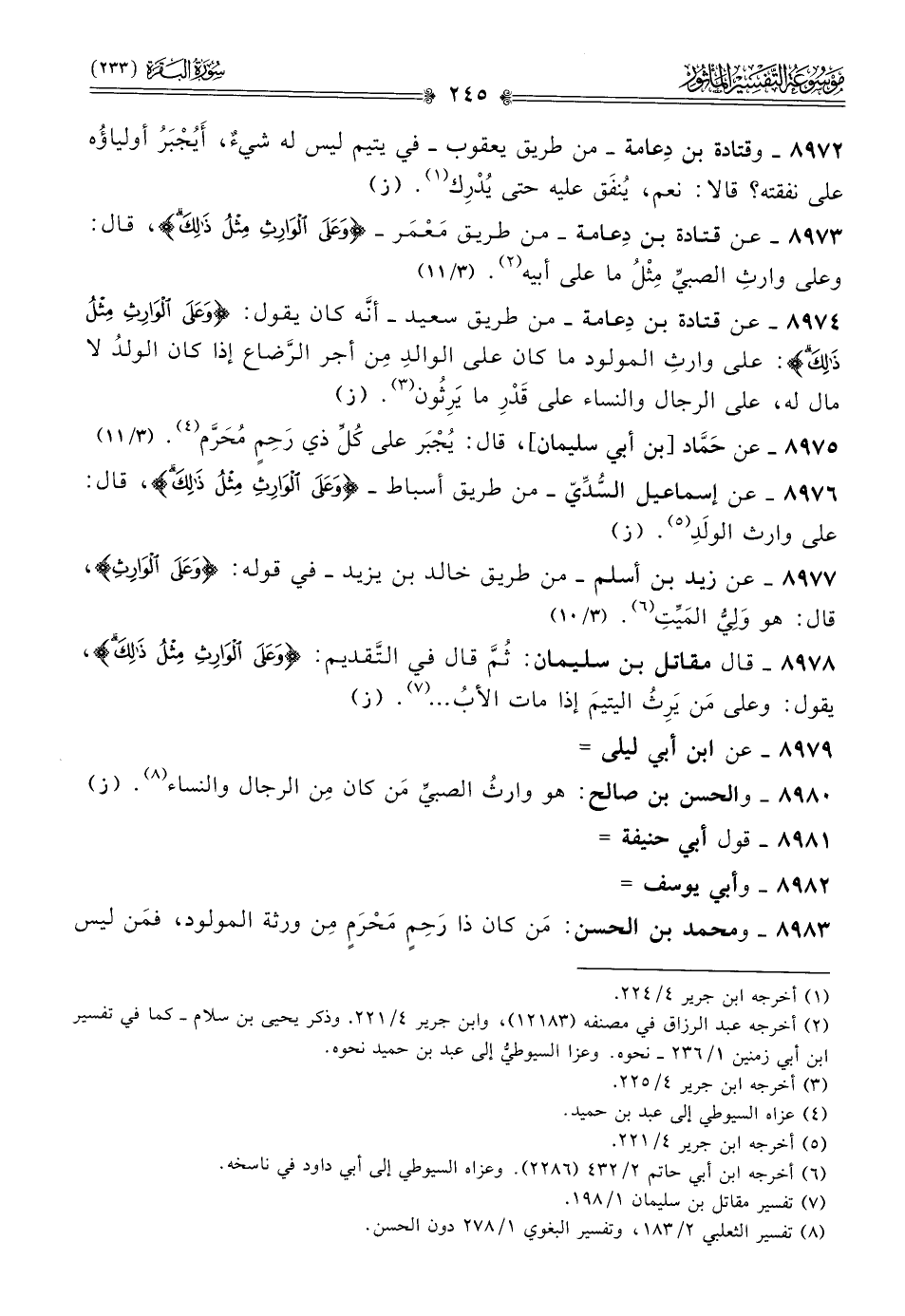 ٨٩٧٣ - عن قتادة بن دِعامة -من طريق مَعْمَر- {وعلى الوارث مثل ذلك}، قال: وعلى وارثِ الصبيِّ مِثْلُ ما على أبيه (¬٢). (٣/ ١١)