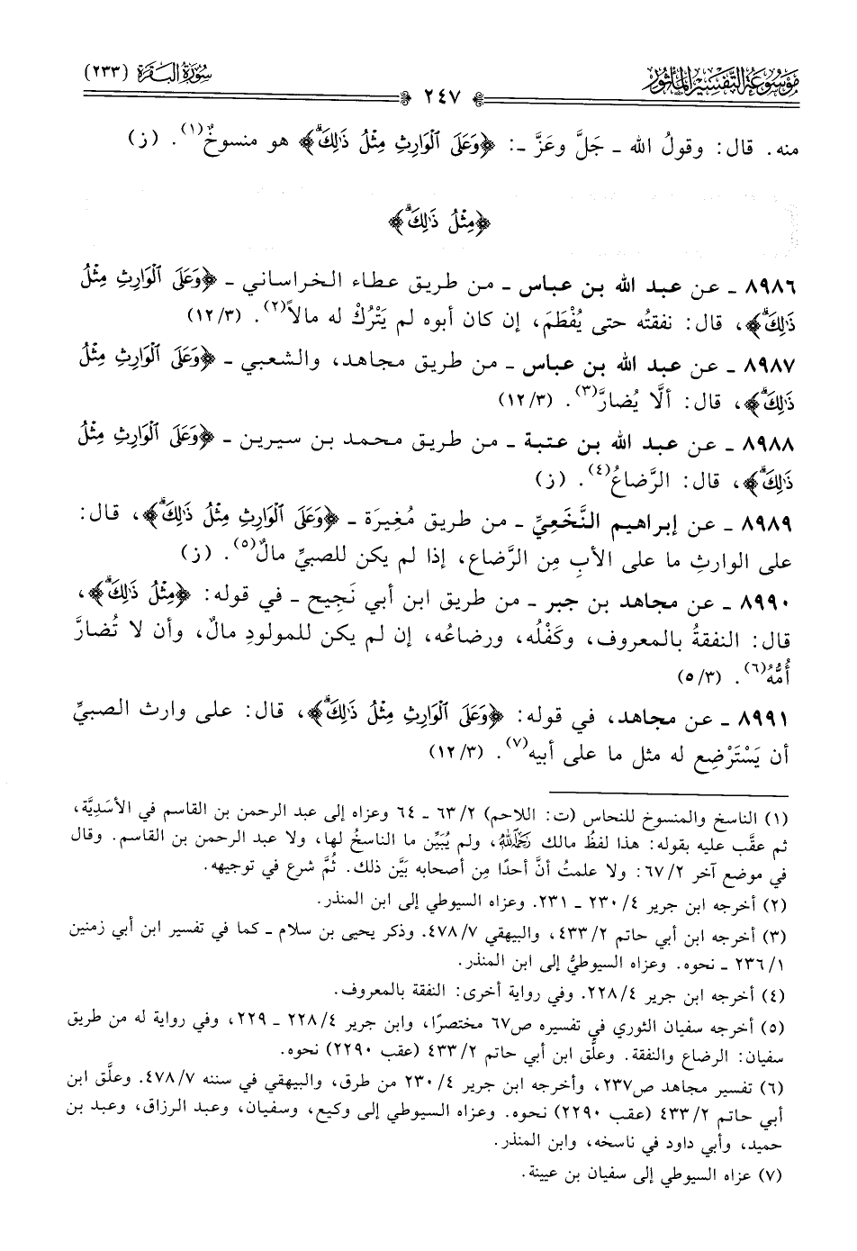 ٨٩٩١ - عن مجاهد، في قوله: {وعلى الوارث مثل ذلك}، قال: على وارث الصبيِّ أن يَسْتَرْضِع له مثل ما على أبيه (¬٧). (٣/ ١٢)