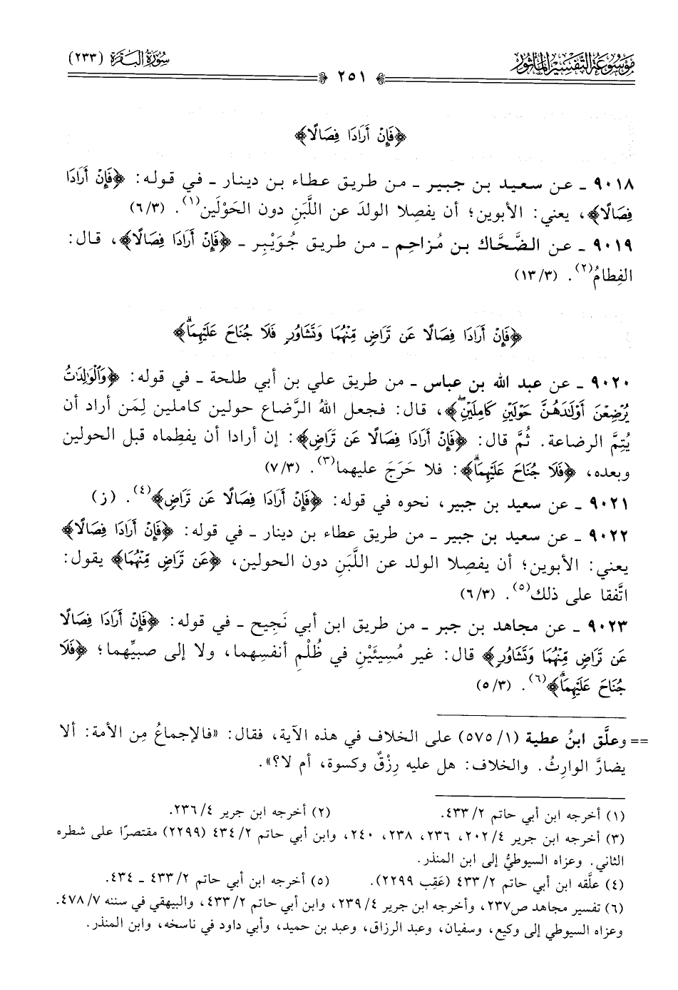٩٠٢٣ - عن مجاهد بن جبر -من طريق ابن أبي نَجِيح- في قوله: {فإن أرادا فصالا عن تراض منهما وتشاور} قال: غير مُسِيئَيْنِ في ظُلْمِ أنفسِهما، ولا إلى صبيِّهما؛ {فلا جناح عليهما} (¬٦). (٣/ ٥)