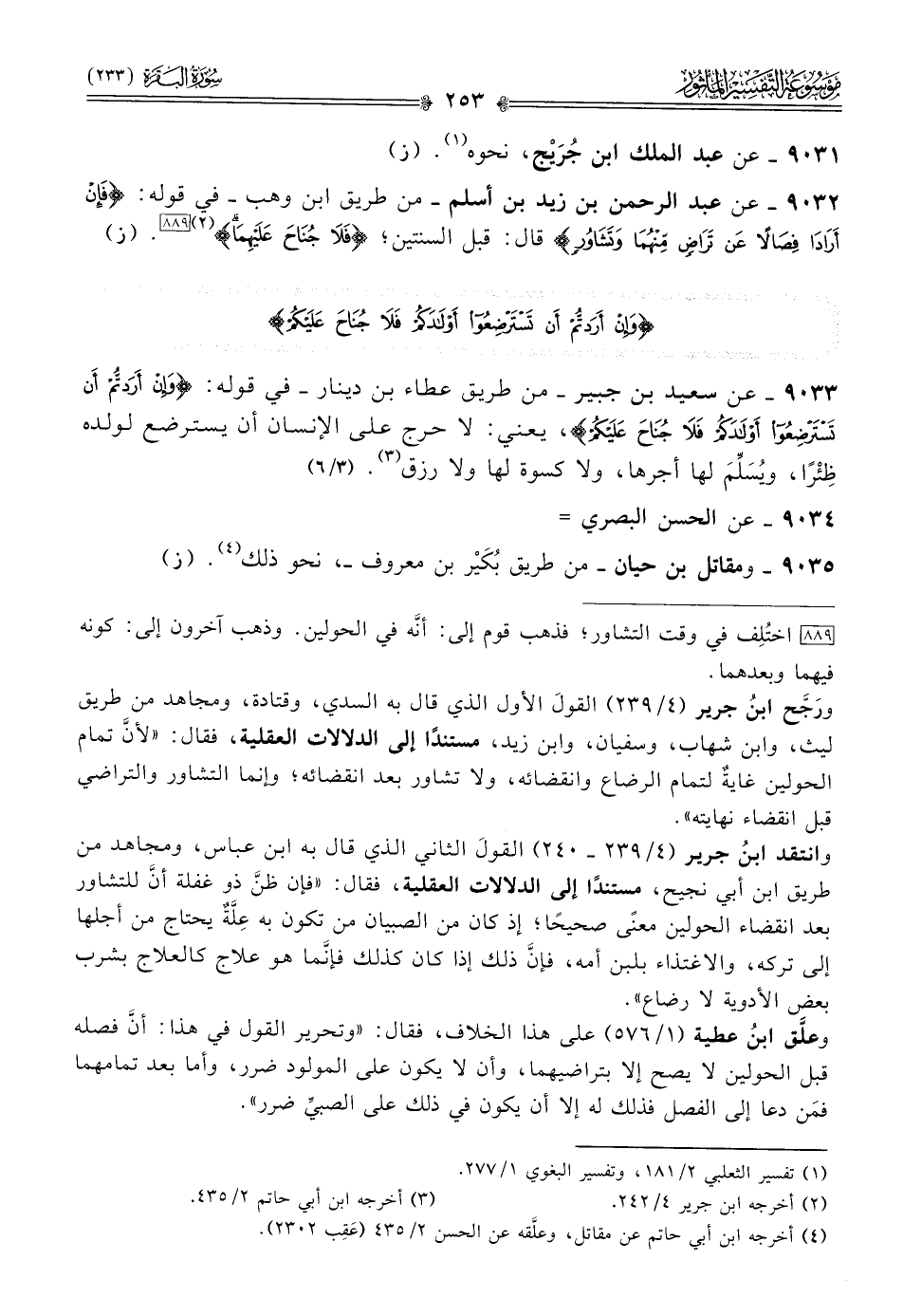 ورَجَّح ابنُ جرير (٤/ ٢٣٩) القولَ الأول الذي قال به السدي، وقتادة، ومجاهد من طريق ليث، وابن شهاب، وسفيان، وابن زيد، مستندًا إلى الدلالات العقلية، فقال: «لأنّ تمام الحولين غايةٌ لتمام الرضاع وانقضائه، ولا تشاور بعد انقضائه؛ وإنما التشاور والتراضي قبل انقضاء نهايته».