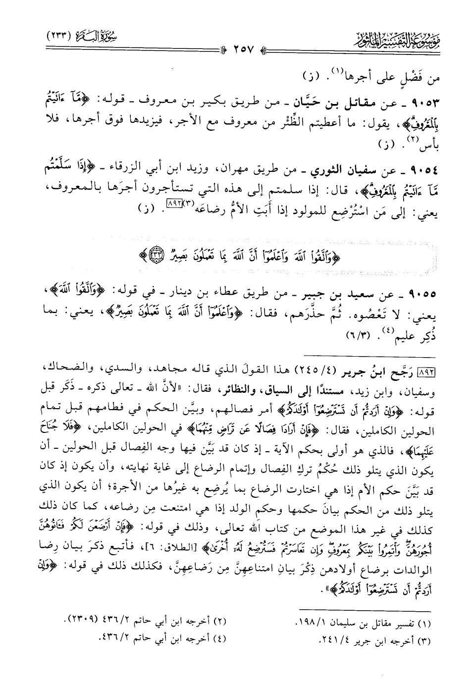 ٩٠٥٤ - عن سفيان الثوري -من طريق مهران، وزيد ابن أبي الزرقاء- {إذا سَلَّمْتُمْ ما آتَيْتُمْ بِالمَعْرُوفِ}، قال: إذا سلمتم إلى هذه التي تستأجرون أجرَها بالمعروف، يعني: إلى مَن اسْتُرْضِع للمولود إذا أبَتِ الأمُّ رضاعَه (¬٣) [٨٩٢]. (ز)