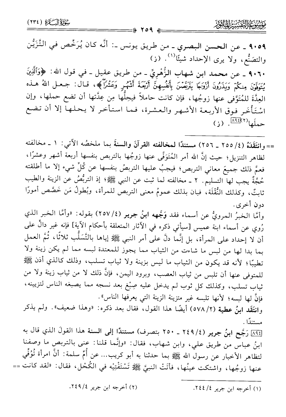 [٨٩٤] رَجَّح ابنُ جرير (٤/ ٢٤٩ - ٢٥٠ بتصرف) مستندًا إلى السنة هذا القولَ الذي قال به ابنُ عباس من طريق علي، وابن شهاب، فقال: «وإنّما قلنا: عنى بالتربص ما وصفنا لتظاهر الأخبار عن رسول الله - صلى الله عليه وسلم - بما حدثنا به أبو كريب ... عن أُمِّ سلمة: أنّ امرأة تُوُفِّي عنها زوجُها، واشتكت عينُها، فأتَتْ النبيَّ - صلى الله عليه وسلم - تَسْتَفْتِيه في الكُحْل، فقال: «لقد كانت إحداكن تكون في الجاهلية في شَرِّ أحلاسِها، فتمكث في بيتها حولًا إذا توفي عنها زوجُها، فيمر عليها الكلبُ فترميه بالبَعْرَة، أفلا أربعة أشهر وعشرا؟!»».ووَجَّهه (٤/ ٢٥٥) ذاكرًا مستندَهم مِن العموم بقوله: «وأمّا الذين أوجبوا الإحداد على المتوفى عنها زوجها، وتركَ النُّقْلَة عن منزلها الذي كانت تسكنه يوم تُوُفِّي عنها زوجُها؛ فإنّهم اعْتَلُّوا بظاهر التنزيل، وقالوا: أمر الله المُتَوَفّى عنها أن تَرَبَّص بنفسها أربعةَ أشهر وعشرًا، فلم يأمرها بالتَّرَبُّصِ بشيء مُسَمًّى في التنزيل بعينه، بل عَمَّ بذلك معانيَ التَّرَبُّصِ. قالوا: فالواجب عليها أن تَرَبَّص بنفسها عن كل شيء، إلا ما أطلقته لها حُجَّةٌ يجب التسليم لها». وذكر من الآثار ما يدل على دخول التَّزَيُّنِ والتَّطَيُّبِ والنُّقْلَةِ في هذا العموم.