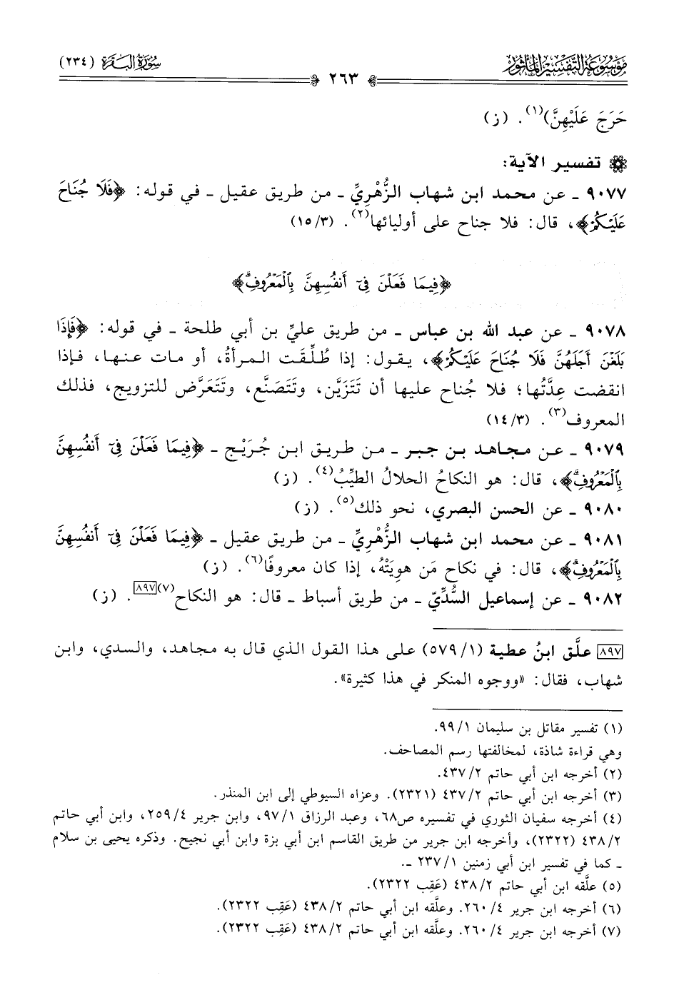 ٩٠٧٨ - عن عبد الله بن عباس -من طريق عليِّ بن أبي طلحة- في قوله: {فإذا بلغن أجلهن فلا جناح عليكم}، يقول: إذا طُلِّقَت المرأةُ، أو مات عنها، فإذا انقضت عِدَّتُها؛ فلا جُناح عليها أن تَتَزَيَّن، وتَتَصَنَّع، وتَتَعَرَّض للتزويج، فذلك المعروف (¬٣). (٣/ ١٤)