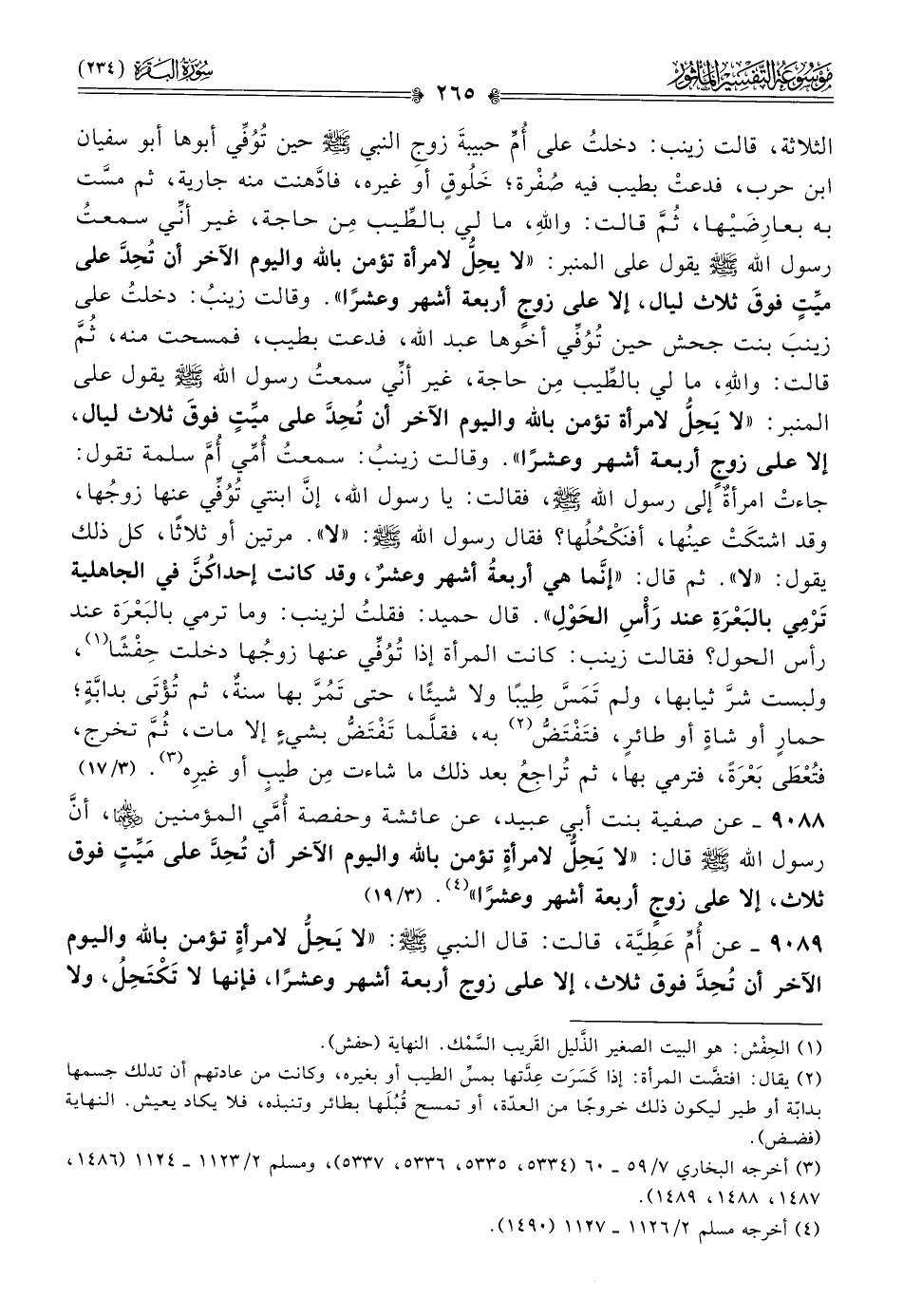 الثلاثة، قالت زينب: دخلتُ على أُمِّ حبيبةَ زوجِ النبي - صلى الله عليه وسلم - حين تُوُفِّي أبوها أبو سفيان ابن حرب، فدعتْ بطيب فيه صُفْرة؛ خَلُوقٍ أو غيره، فادَّهنت منه جارية، ثم مسَّت به بعارِضَيْها، ثُمَّ قالت: واللهِ، ما لي بالطِّيب مِن حاجة، غير أنِّي سمعتُ رسول الله - صلى الله عليه وسلم - يقول على المنبر: «لا يحِلُّ لامرأة تؤمن بالله واليوم الآخر أن تُحِدَّ على ميِّتٍ فوقَ ثلاث ليال، إلا على زوجٍ أربعة أشهر وعشرًا». وقالت زينبُ: دخلتُ على زينبَ بنت جحش حين تُوُفِّي أخوها عبد الله، فدعت بطيب، فمسحت منه، ثُمَّ قالت: واللهِ، ما لي بالطِّيب مِن حاجة، غير أنِّي سمعتُ رسول الله - صلى الله عليه وسلم - يقول على المنبر: «لا يَحِلُّ لامرأة تؤمن بالله واليوم الآخر أن تُحِدَّ على ميِّتٍ فوقَ ثلاث ليال، إلا على زوجٍ أربعة أشهر وعشرًا». وقالت زينبُ: سمعتُ أُمِّي أُمَّ سلمة تقول: جاءتْ امرأةٌ إلى رسول الله - صلى الله عليه وسلم -، فقالت: يا رسول الله، إنّ ابنتي تُوُفِّي عنها زوجُها، وقد اشتكَتْ عينُها، أفنَكْحُلُها؟ فقال رسول الله - صلى الله عليه وسلم -: «لا». مرتين أو ثلاثًا، كل ذلك يقول: «لا». ثم قال: «إنّما هي أربعةُ أشهر وعشرٌ، وقد كانت إحداكُنَّ في الجاهلية تَرْمِي بالبَعْرَةِ عند رَأْسِ الحَوْلِ». قال حميد: فقلتُ لزينب: وما ترمي بالبَعْرَة عند رأس الحول؟ فقالت زينب: كانت المرأة إذا تُوُفِّي عنها زوجُها دخلت حِفْشًا (¬١)، ولبست شرَّ ثيابها، ولم تَمَسَّ طِيبًا ولا شيئًا، حتى تَمُرَّ بها سنةٌ، ثم تُؤْتى بدابَّةٍ؛ حمارٍ أو شاةٍ أو طائرٍ، فتَفْتَضُّ (¬٢) به، فقلَّما تَفْتَضُّ بشيءٍ إلا مات، ثُمَّ تخرج، فتُعْطى بَعْرَةً، فترمي بها، ثم تُراجِعُ بعد ذلك ما شاءت مِن طيبٍ أو غيرِه (¬٣).