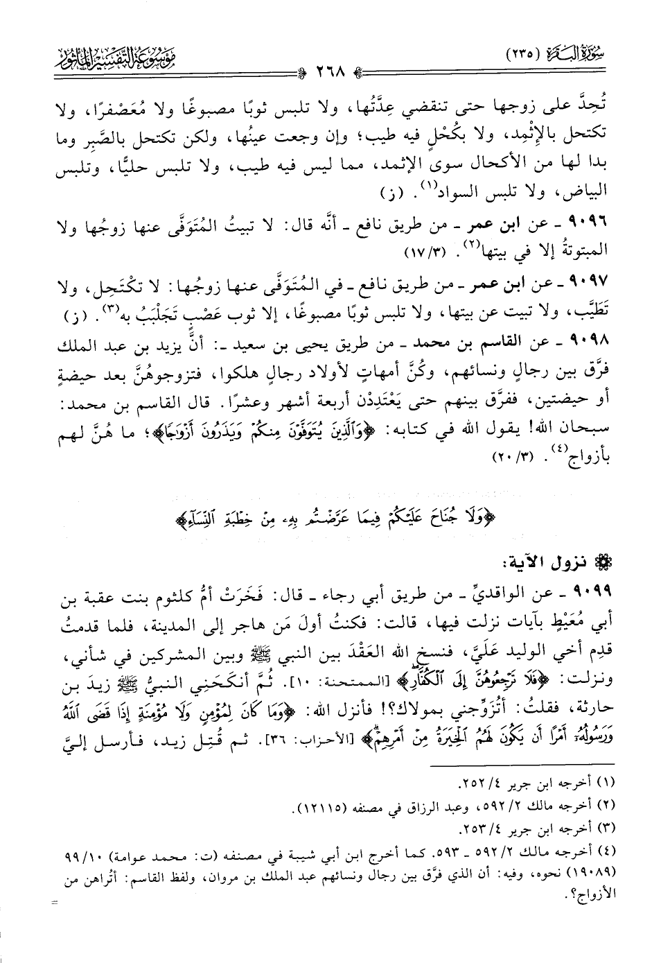 ٩٠٩٨ - عن القاسم بن محمد -من طريق يحيى بن سعيد-: أنّ يزيد بن عبد الملك فرَّق بين رجالٍ ونسائهم، وكُنَّ أمهاتٍ لأولاد رجالٍ هلكوا، فتزوجوهُنَّ بعد حيضةٍ أو حيضتين، ففرَّق بينهم حتى يَعْتَدِدْن أربعة أشهر وعشرًا. قال القاسم بن محمد: سبحان الله! يقول الله في كتابه: {والذين يتوفون منكم ويذرون أزواجا}؛ ما هُنَّ لهم بأزواج (¬٤). (٣/ ١٤)