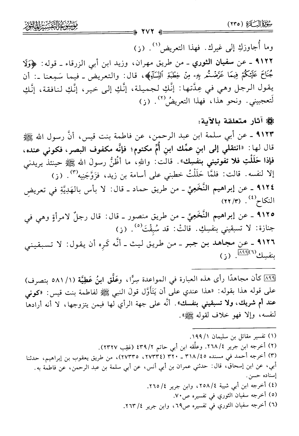 [٨٩٩] كأن مجاهدًا رأى هذه العبارة في المواعدة سِرًّا، وعَلَّق ابنُ عَطِيَّة (١/ ٥٨١ بتصرف) على قوله هذا بقوله: «هذا عندي على أن يَتَأَوَّل قولَ النبي - صلى الله عليه وسلم - لفاطمة بنت قيس: «كوني عند أم شريك، ولا تسبقيني بنفسك». أنّه على جهة الرأي لها فيمن يتزوجها، لا أنه أرادها لنفسه، وإلا فهو خلاف لقوله - صلى الله عليه وسلم -».