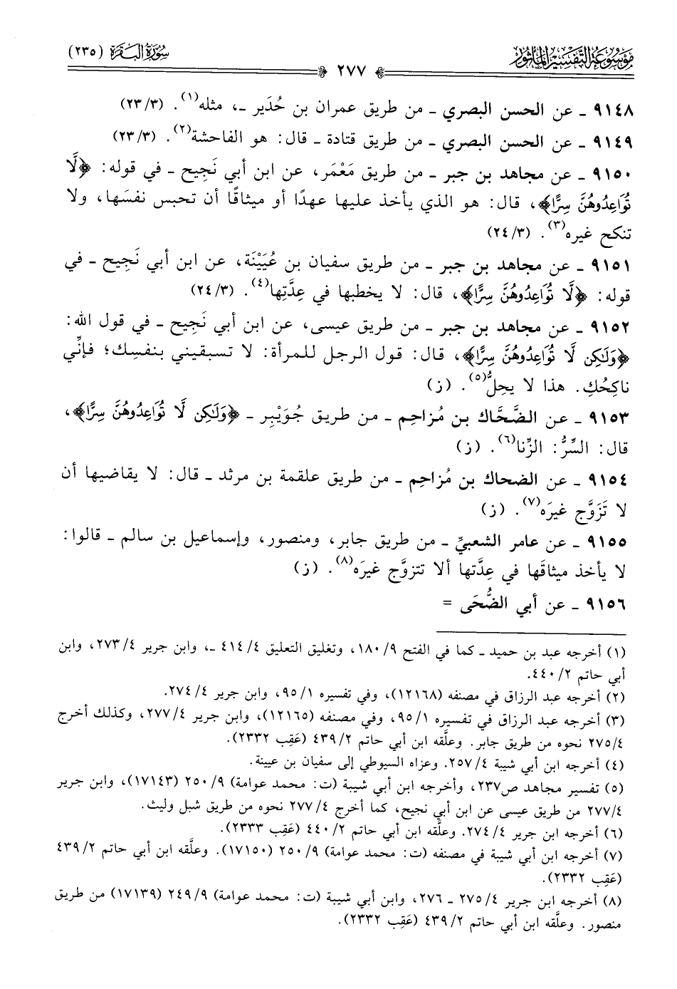 ٩١٥٣ - عن الضَّحّاك بن مُزاحِم -من طريق جُوَيْبِر- {ولَكِنْ لا تُواعِدُوهُنَّ سِرًّا}، قال: السِّرُّ: الزِّنا (¬٦). (ز)