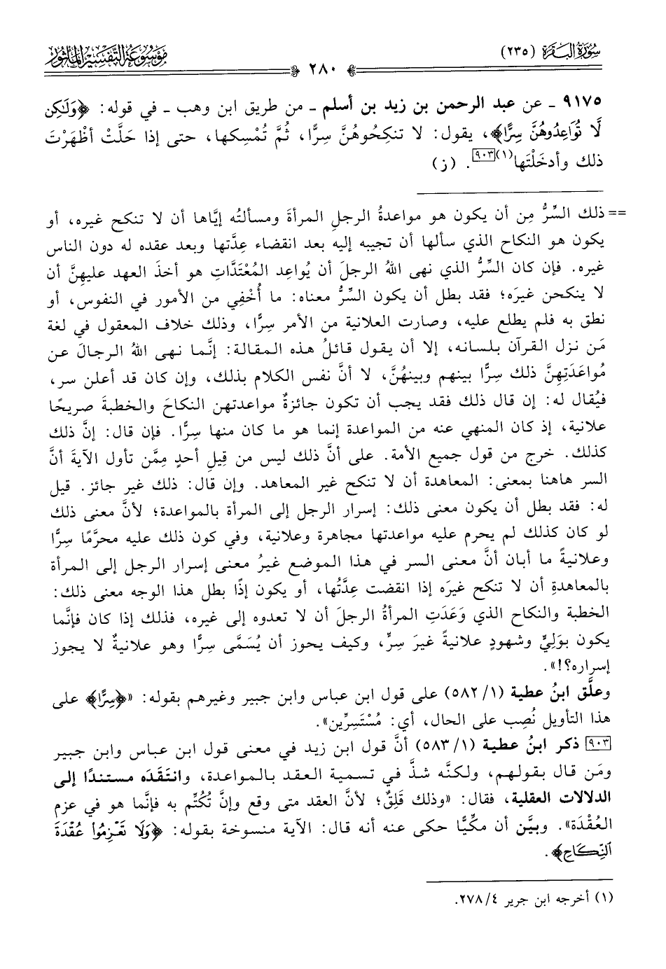 [٩٠٣] ذكر ابنُ عطية (١/ ٥٨٣) أنّ قول ابن زيد في معنى قول ابن عباس وابن جبير ومَن قال بقولهم، ولكنَّه شذَّ في تسمية العقد بالمواعدة، وانتَقَدَه مستندًا إلى الدلالات العقلية، فقال: «وذلك قَلِقٌ؛ لأنّ العقد متى وقع وإنّ تُكُتِّم به فإنّما هو في عزم العُقْدَة». وبيَّن أن مكِّيًّا حكى عنه أنه قال: الآية منسوخة بقوله: {ولا تعزموا عقدة النكاح}.