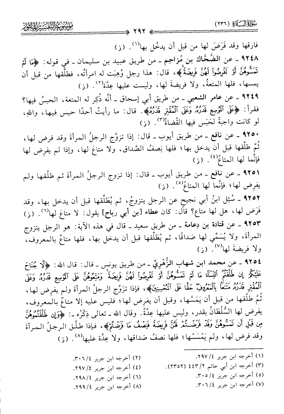 ٩٢٥٤ - عن محمد ابن شهاب الزُّهْرِيِّ -من طريق يونس- قال: قال الله: {لا جناح عليكم إن طلقتم النساء ما لم تمسوهن أو تفرضوا لهن فريضة ومتعوهن على الموسع قدره وعلى المقتر قدره متاعا بالمعروف حقا على المحسنين}، فإذا تزَوَّج الرجلُ المرأةَ ولم يفرِض لها، ثُمَّ طلَّقها من قبل أن يَمَسَّها، وقبل أن يفرِض لها؛ فليس عليه إلا متاعٌ بالمعروف، يفرض لها السُّلْطانُ بقدر، وليس عليها عِدَّةٌ. وقال الله -تعالى ذِكْرُه-: {وإن طلقتموهن من قبل أن تمسوهن وقد فرضتم لهن فريضة فنصف ما فرضتم}، فإذا طلَّق الرجلُ المرأةَ وقد فرض لها، ولم يَمْسَسْها؛ فلها نصفُ صَداقها، ولا عِدَّة عليها (¬٨). (ز)