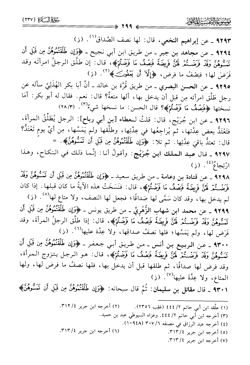 ٩٢٩٨ - عن قتادة بن دِعامة -من طريق سعيد- {وإن طلقتموهن من قبل أن تمسوهن وقد فرضتم لهن فريضة فنصف ما فرضتم}، قال: فنَسَخَتْ هذه الآيةُ ما كان قبلها. إذا كان لم يدخل بها، وقد كان سَمّى لها صَداقًا؛ فجعل لها النصف، ولا متاع لها (¬٥). (ز)