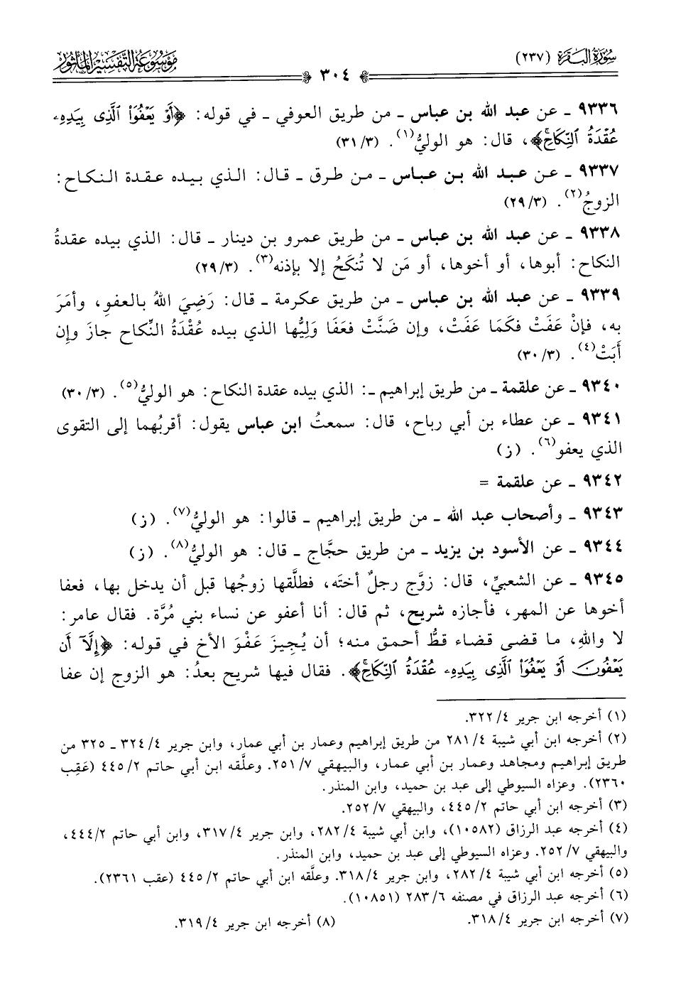 ٩٣٣٦ - عن عبد الله بن عباس -من طريق العوفي- في قوله: {أو يعفو الذي بيده عقدة النكاح}، قال: هو الوليُّ (¬١).