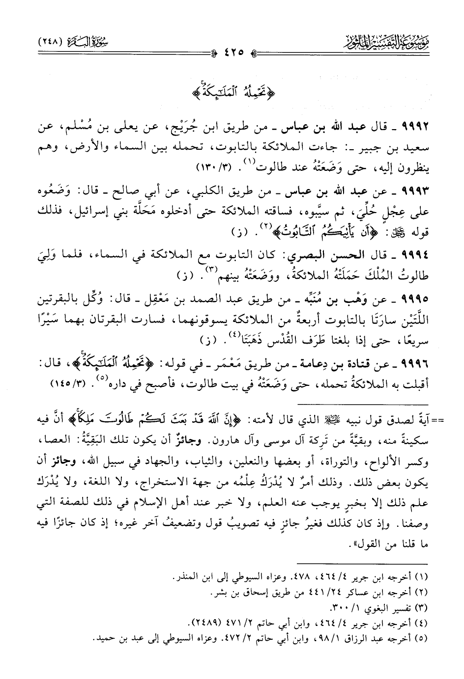 ٩٩٩٢ - قال عبد الله بن عباس -من طريق ابن جُرَيْج، عن يعلى بن مُسْلم، عن سعيد بن جبير-: جاءت الملائكة بالتابوت، تحمله بين السماء والأرض، وهم ينظرون إليه، حتى وضَعَتْهُ عند طالوت (¬١). (٣/ ١٣٠)