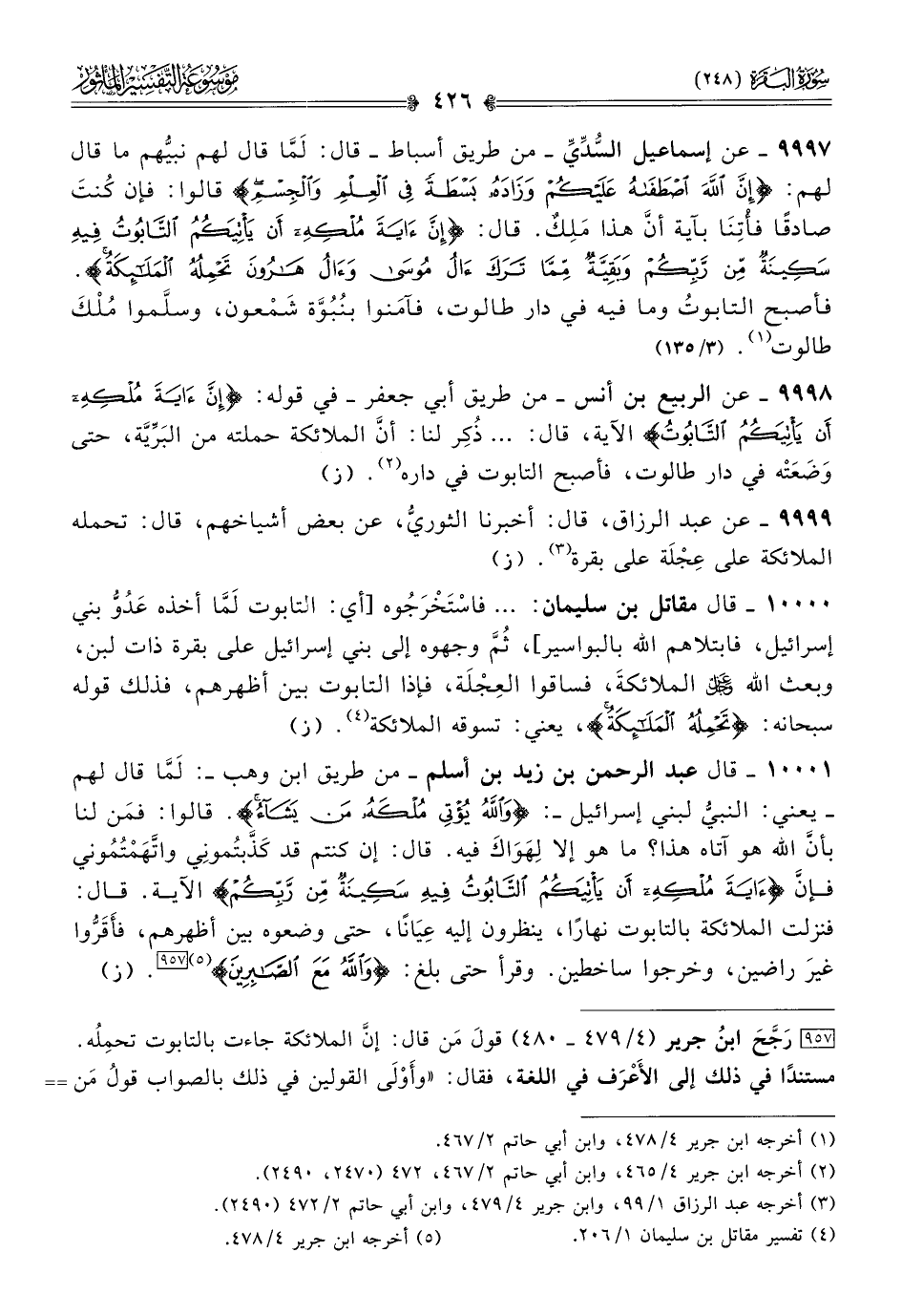 ٩٩٩٧ - عن إسماعيل السُّدِّيِّ -من طريق أسباط- قال: لَمّا قال لهم نبيُّهم ما قال لهم: {إن الله اصطفاه عليكم وزاده بسطة في العلم والجسم} قالوا: فإن كُنتَ صادقا فأْتِنا بآية أنّ هذا مَلِكٌ. قال: {إن آية ملكه أن يأتيكم التابوت فيه سكينة من ربكم وبقية مما ترك آل موسى وآل هارون تحمله الملائكة}. فأصبح التابوتُ وما فيه في دار طالوت، فآمَنوا بنُبُوَّة شَمْعون، وسلَّموا مُلْكَ طالوت (¬١). (٣/ ١٣٥)