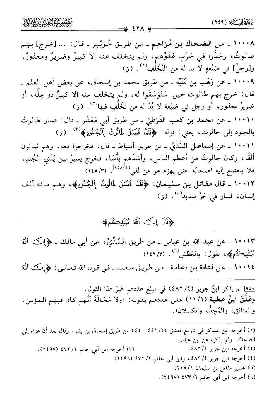 ١٠٠١١ - عن إسماعيل السُّدِّيِّ -من طريق أسباط- قال: فخرجوا معه، وهم ثمانون ألفًا، وكان جالوتُ من أعظم الناس، وأشدِّهم بأْسًا، فخرج يسيرُ بين يَدَيِ الجُندِ، فلا يجتمع إليه أصحابُه حتى يهزم هو من لقي (¬٤) [٩٥٨]. (٣/ ١٤٥)