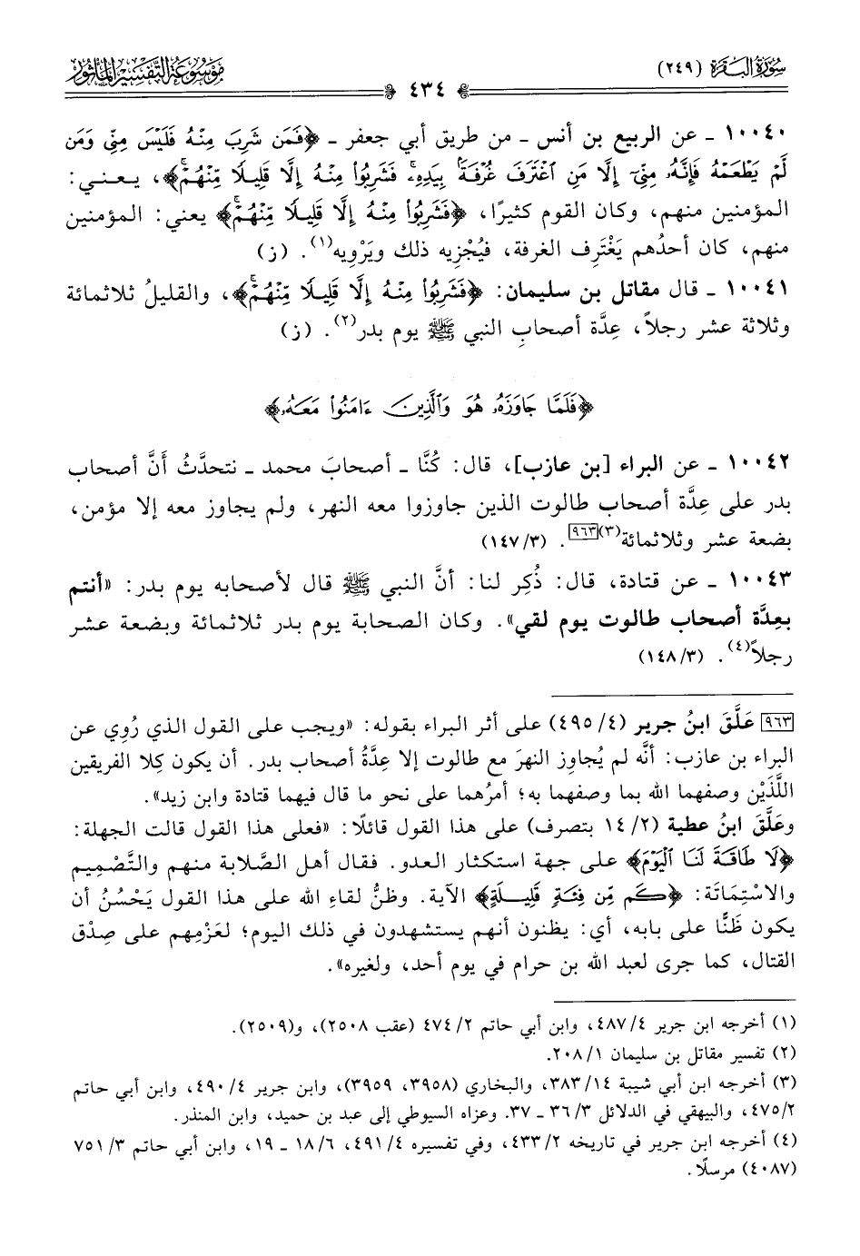 [٩٦٣] عَلَّقَ ابنُ جرير (٤/ ٤٩٥) على أثر البراء بقوله: «ويجب على القول الذي رُوِي عن البراء بن عازب: أنّه لم يُجاوِز النهرَ مع طالوت إلا عِدَّةُ أصحاب بدر. أن يكون كِلا الفريقين اللَّذَيْن وصفهما الله بما وصفهما به؛ أمرُهما على نحو ما قال فيهما قتادة وابن زيد».