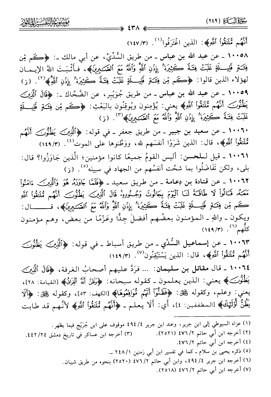 ١٠٠٦٣ - عن إسماعيل السُّدِّي -من طريق أسباط- في قوله: {الذين يظنون أنهم ملاقو الله}، قال: الذين يَسْتَيْقِنُون (¬٧).