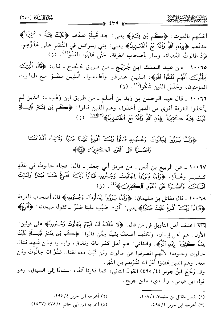[٩٦٦] اختلف أهل التأويل في مَن قال: {لا طاقة لنا اليوم بجالوت وجنوده} على قولين: الأول: هم أهل إيمان، ولكنَّهم أضعفُ يقينًا مِمَّن قالوا: {كم مِن فئة قليلة غلبت فئة كثيرة بإذن الله}. والثاني: هم أهل كفر بالله ونفاق، وليسوا مِمَّن شَهِد قتال جالوت وجنوده؛ لأنّهم انصرفوا عن طالوت ومَن ثَبَتَ معه لقتال عَدُوِّ الله جالُوتَ ومَن معه، وهم الذين عَصَوْا أمْرَ اللهِ لِشُرْبِهِم مِن النَّهَر.