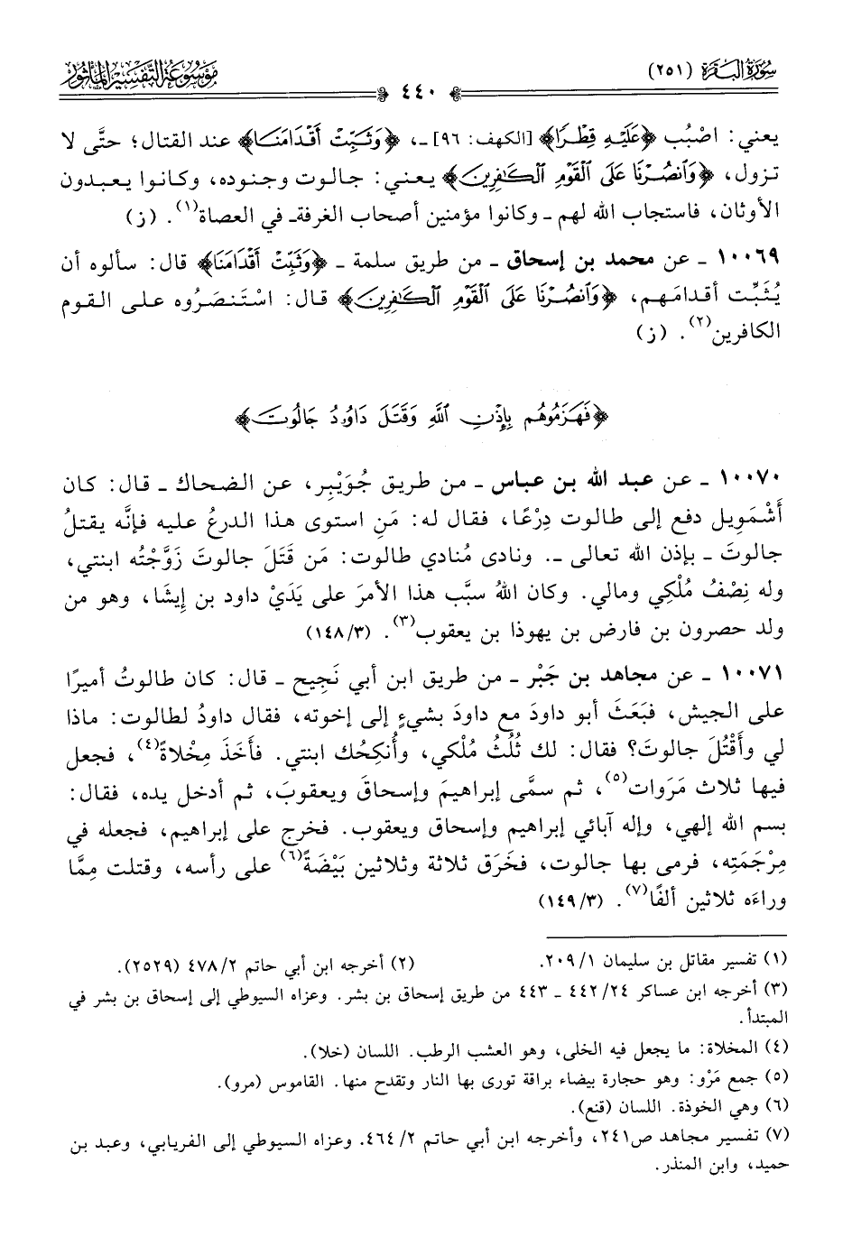 ١٠٠٧١ - عن مجاهد بن جَبْر -من طريق ابن أبي نَجِيح- قال: كان طالوتُ أميرًا على الجيش، فبَعَثَ أبو داودَ مع داودَ بشيءٍ إلى إخوته، فقال داودُ لطالوت: ماذا لي وأَقْتُلَ جالوتَ؟ فقال: لك ثُلُثُ مُلْكي، وأُنكِحُك ابنتي. فأَخَذَ مِخْلاةً (¬٤)، فجعل فيها ثلاث مَرَوات (¬٥)، ثم سمّى إبراهيمَ وإسحاقَ ويعقوبَ، ثم أدخل يده، فقال: بسم الله إلهي، وإله آبائي إبراهيم وإسحاق ويعقوب. فخرج على إبراهيم، فجعله في مِرْجَمَتِه، فرمى بها جالوت، فخَرَق ثلاثة وثلاثين بَيْضَةً (¬٦) على رأسه، وقتلت مِمّا وراءَه ثلاثين ألفًا (¬٧). (٣/ ١٤٩)
