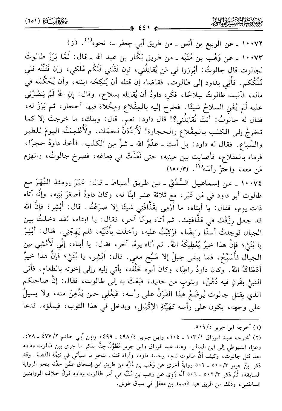 (¬٢) أخرجه عبد الرزاق ١/ ١٠٣ - ١٠٤، وابن جرير ٤/ ٤٩٨ - ٤٩٩، وابن أبي حاتم ٢/ ٤٧٧ - ٤٧٨. وعزاه السيوطي إلى ابن المنذر. وعند عبد الرزاق وابن جرير مُطَوَّلٌ جِدًّا بذكر ما جرى بين طالوت وداود بعد قتل جالوت، وكيف أنّ طالوت ندم، وحسد داود، وأراد قتله. بنحو ما سيأتي في تَتِمَّة القصة. وقد ذكر ابنُ جرير ٣/ ٥٠٠ - ٥٠٢ روايةً أخرى عن وهْب بن مُنَبِّه من طريق ابن إسحاق عمَّن حدَّثه بنحو الرواية السابقة، ثُمَّ ذكر ٣/ ٥٠٢ - ٥٠٦ أنّه رُوِي عن وهب بن مُنَبِّه في أمر طالوت وداود قولٌ خلاف الروايتين السابقتين، وذلك من طريق عبد الصمد بن معقل في سياق طويل.