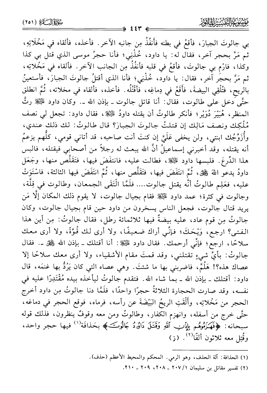 بي جالوتَ الجبارَ، فأقعُ في بطنه فأَنفُذُ مِن جانبه الآخر. فأخذه، فألقاه في مَخْلاتِهِ، ثم مَرَّ بحجر آخر، فقال له: يا داود، خُذْنِي؛ فأنا حجرُ موسى الذي قتل بي كذا وكذا، فارْمِ بي جالوتَ، فأقعُ في قلبه فأنفُذُ مِن الجانب الآخر. فألقاه في مَخْلاتِه، ثم مَرَّ بحجر آخر، فقال: يا داود، خُذْنِي؛ فأنا الذي أقتلُ جالوتَ الجبارَ، فأستعينُ بالريحِ، فتُلْقِي البيضةَ، فأَقَعُ في دِماغِه، فأقْتُلُه. فأخذه، فألقاه في مخلاته، ثُمَّ انطلق حتّى دخل على طالوت، فقال: أنا قاتل جالوت -بإذن اللَّه-. وكان داود - عليه السلام - رثَّ المنظر، هُبَيْرَ دُوَيْر؛ فأنكر طالوتُ أن يقتله داودُ - عليه السلام -، فقال داود: تجعل لي نصف مُلْكِك ونصف مالِك إن قتلتُ جالوتَ الجبارَ؟ قال طالوتُ: لك ذلك عندي، وأُزَوِّجُك ابنتي، ولن يخفى عَلَيَّ إن كنتَ أنت صاحبه، قد أتاني قومي، كلُّهم يزعمُ أنه يقتله، وقد أخبرني إسماعيلُ أنّ الله يبعث له رجلًا من أصحابي فيقتله، فالبس هذا الدِّرعَ. فلبسها داود - عليه السلام -، فطالت عليه، فانتفَضَ فيها، فتَقَلَّص منها، وجَعَل داودُ يدعو اللهَ - عز وجل -، ثُمَّ انتَفَضَ فيها، فتَقَلَّص منها، ثُمَّ انتَفَضَ فيها الثالثة، فاسْتَوَتْ عليه، فعَلِم طالوتُ أنّه يقتل جالوت. ... فلَمّا التَقى الجمعان، وطالوت في قِلَّة، وجالوت في كثرة؛ عمد داود - عليه السلام - فقام بحِيال جالوت، لا يقوم ذلك المكان إلّا مَن يريد قتال جالوت، فجعل الناس يسخرون من داود حين قام بحِيال جالوت، وكان جالوتُ مِن قوم عاد، عليه بيضةٌ فيها ثلاثمائة رطل، فقال جالوتُ: مِن أين هذا الفتى؟ ارجع، ويْحَكَ؛ فإنِّي أراك ضعيفًا، ولا أرى لك قُوَّةً، ولا أرى معك سلاحًا، ارجع؛ فإنِّي أرحمك. فقال داود - عليه السلام -: أنا أقتلك -بإذن الله - عز وجل -. فقال جالوتُ: بأيِّ شيءٍ تقتلني، وقد قمتَ مقام الأشقياء، ولا أرى معك سلاحًا إلا عصاك هذه؟! هَلُمَّ، فاضربني بها ما شئتَ. وهي عصاه التي كان يَرُدُّ بها غنمَه، قال داود: أقتلك -بإذن الله- بما شاء الله. فتقدم جالوتُ ليأخذه بيده مُقْتَدِرًا عليه في نفسه، وقد صارت الحجارة الثلاثةُ حجرًا واحدًا، فلَمّا دنا جالوتُ مِن داود أخرج الحجر من مَخْلاتِه، وأَلْقَتِ الريحُ البَيْضَةَ عن رأسه، فرماه، فوقع الحجر في دماغه، حتّى خرج من أسفله، وانهزم الكفار، وطالوتُ ومن معه وقوفٌ ينظرون، فذلك قوله سبحانه: {فَهَزَمُوهُمْ بِإذْنِ اللَّهِ وقَتَلَ داوُدُ جالُوتَ} بحَذافَة (¬١) فيها حجر واحد، وقُتِل معه ثلاثون ألفًا (¬٢). (ز)