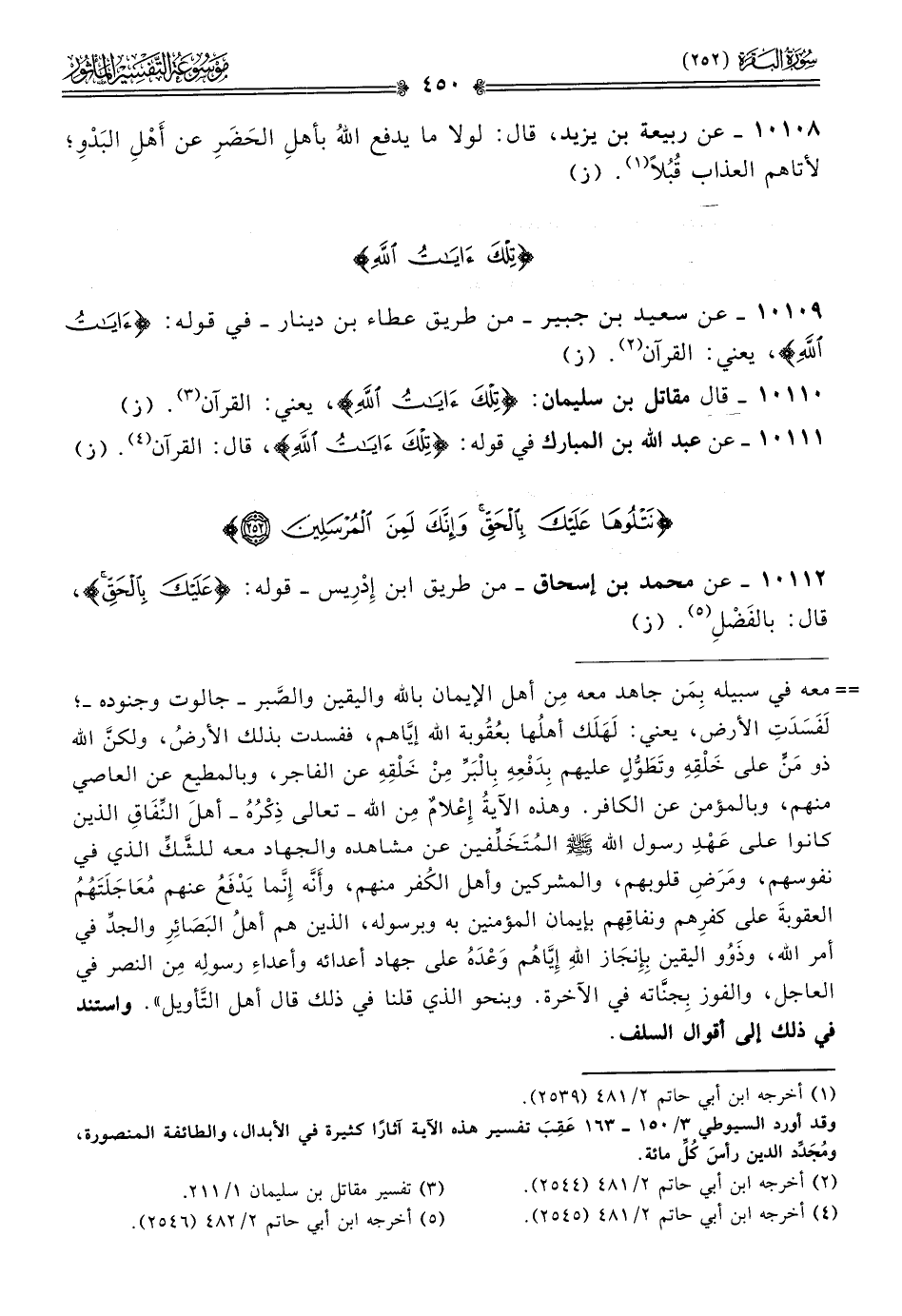 ١٠١١١ - عن عبد الله بن المبارك في قوله: {تلك آيات الله}، قال: القرآن (¬٤). (ز)