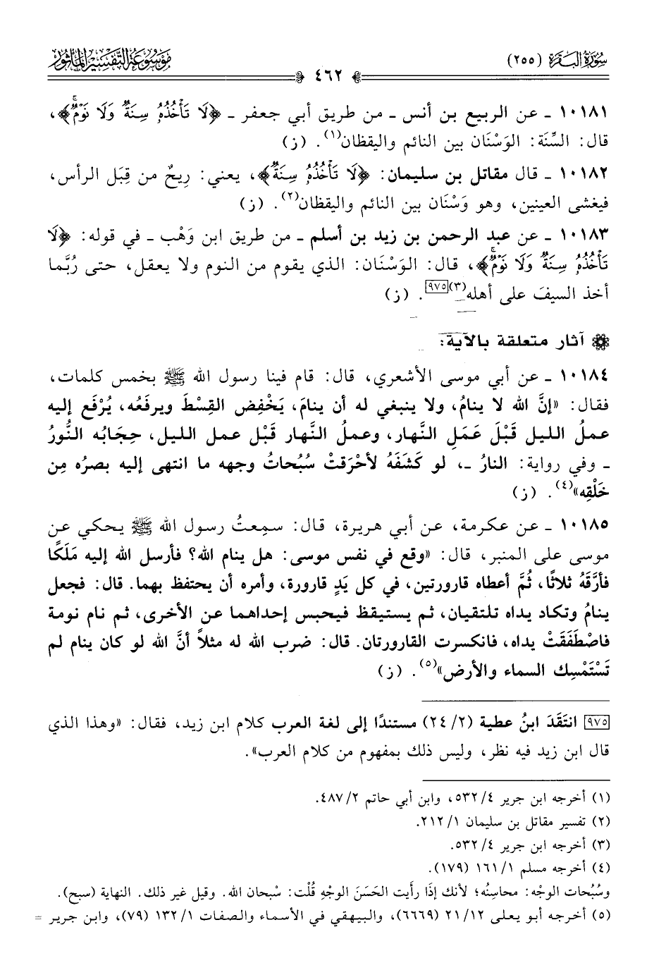 ١٠١٨٣ - عن عبد الرحمن بن زيد بن أسلم -من طريق ابن وهْب- في قوله: {لا تأخذه سنه ولا نوم}، قال: الوَسْنان: الذي يقوم من النوم ولا يعقل، حتى رُبَّما أخذ السيفَ على أهله (¬٣) [٩٧٥]. (ز)