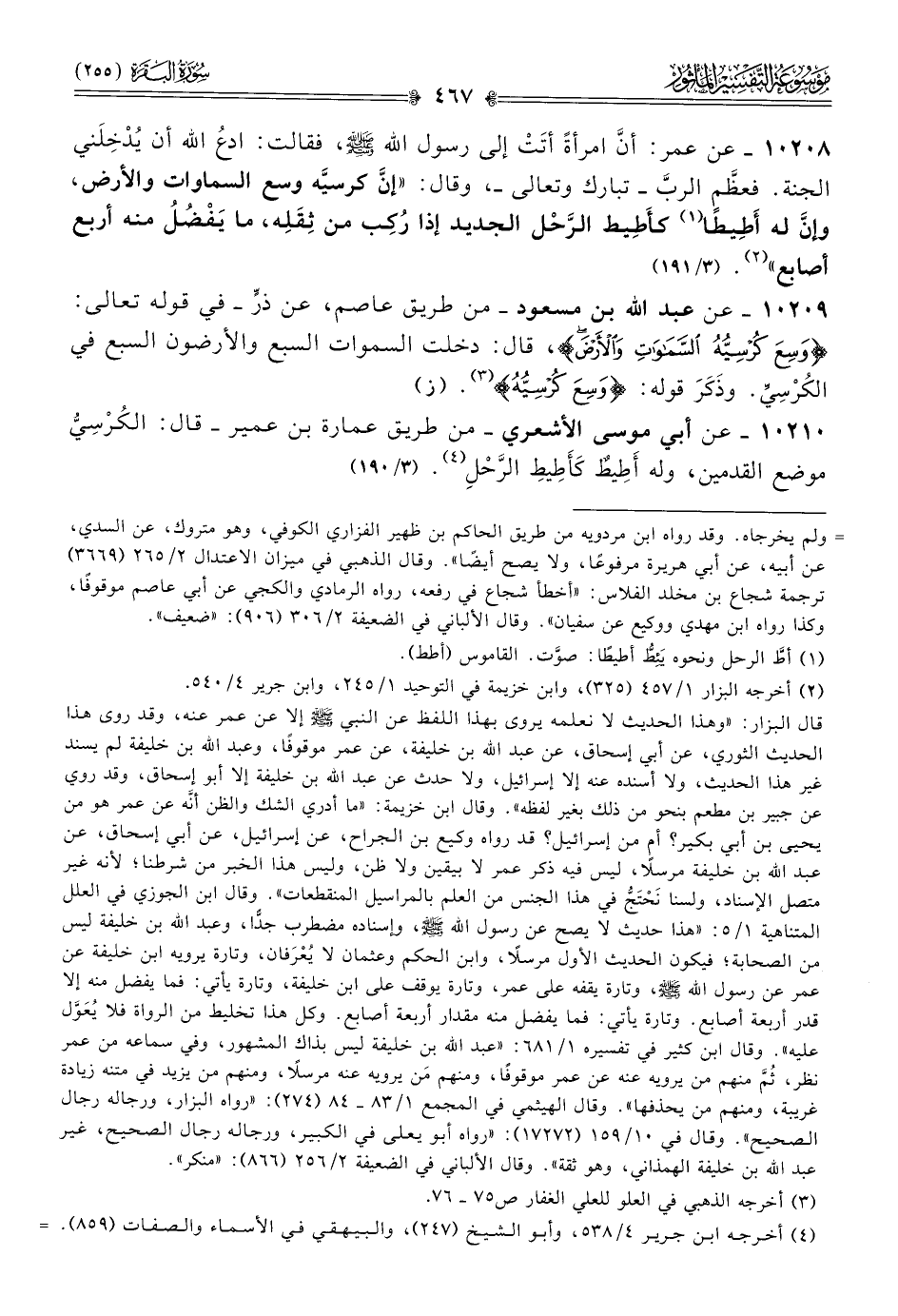 ١٠٢٠٨ - عن عمر: أنّ امرأةً أتَتْ إلى رسول الله - صلى الله عليه وسلم -، فقالت: ادعُ الله أن يُدْخِلَني الجنة. فعظَّم الربَّ -تبارك وتعالى-، وقال: «إنّ كرسيَّه وسع السماوات والأرض، وإنّ له أطِيطًا (¬١) كأَطِيط الرَّحْل الجديد إذا رُكِب من ثِقَلِه، ما يَفْضُلُ منه أربع أصابع» (¬٢). (٣/ ١٩١)