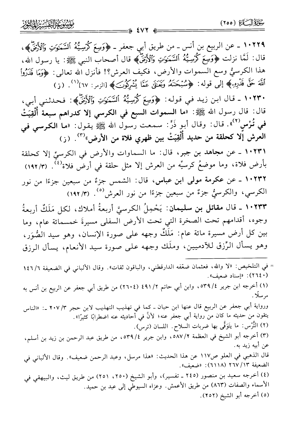 ١٠٢٣١ - عن مجاهد بن جبر، قال: ما السماوات والأرض في الكرسيِّ إلا كحلقة بأرض فلاة، وما موضعُ كرسيِّه من العرش إلا مثل حلقة في أرض فلاة (¬٤). (٣/ ١٨٨)