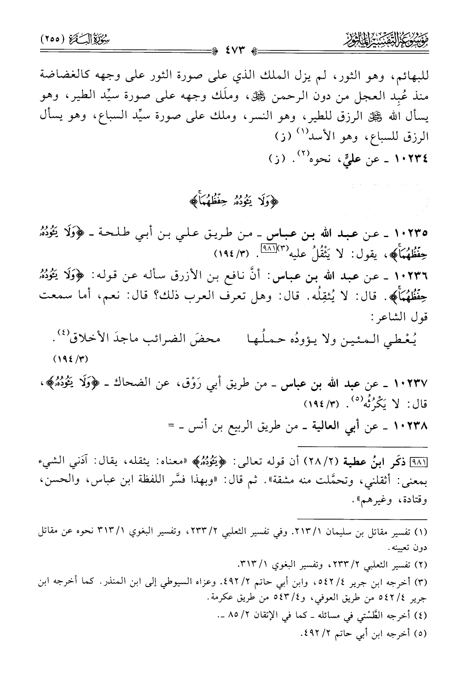 ١٠٢٣٥ - عن عبد الله بن عباس -من طريق علي بن أبي طلحة- {ولا يؤده حفظهما}، يقول: لا يَثْقُلُ عليه (¬٣) [٩٨١].