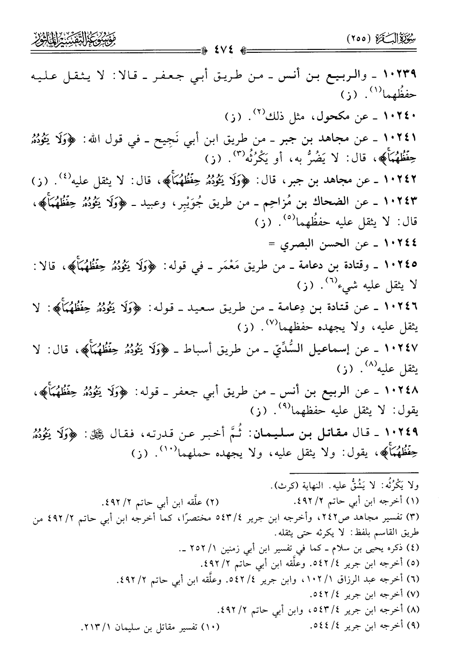 ١٠٢٤٨ - عن الربيع بن أنس -من طريق أبي جعفر- قوله: {ولا يَئُودُهُ حِفْظُهُما}، يقول: لا يثقل عليه حفظهما (¬٩). (ز)