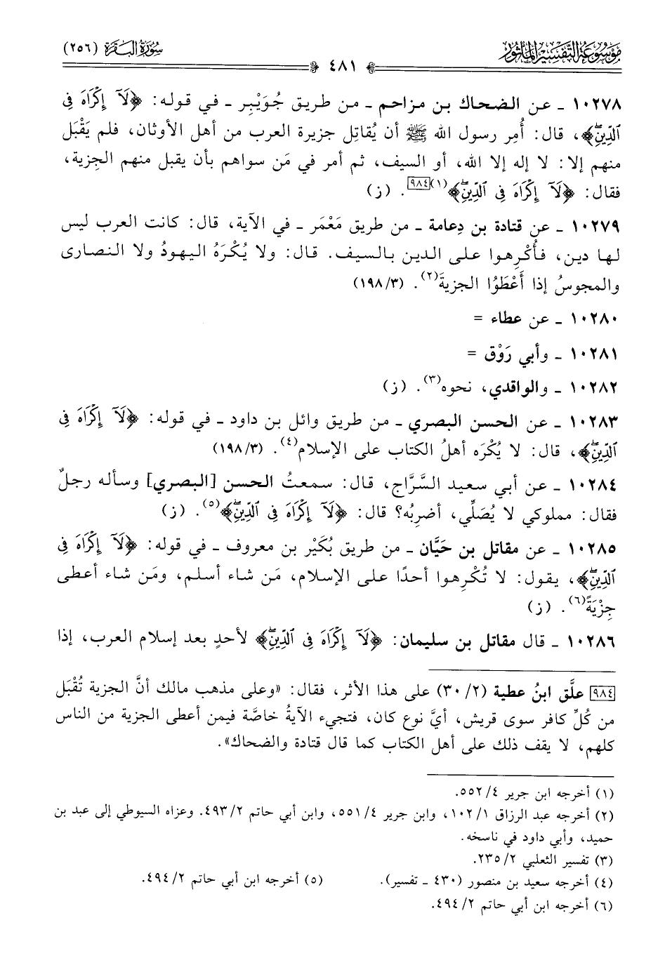 ١٠٢٨٥ - عن مقاتل بن حَيّان -من طريق بُكَيْر بن معروف- في قوله: {لا إكْراهَ فِي الدِّينِ}، يقول: لا تُكْرِهوا أحدًا على الإسلام، مَن شاء أسلم، ومَن شاء أعطى جِزْيَةً (¬٦). (ز)