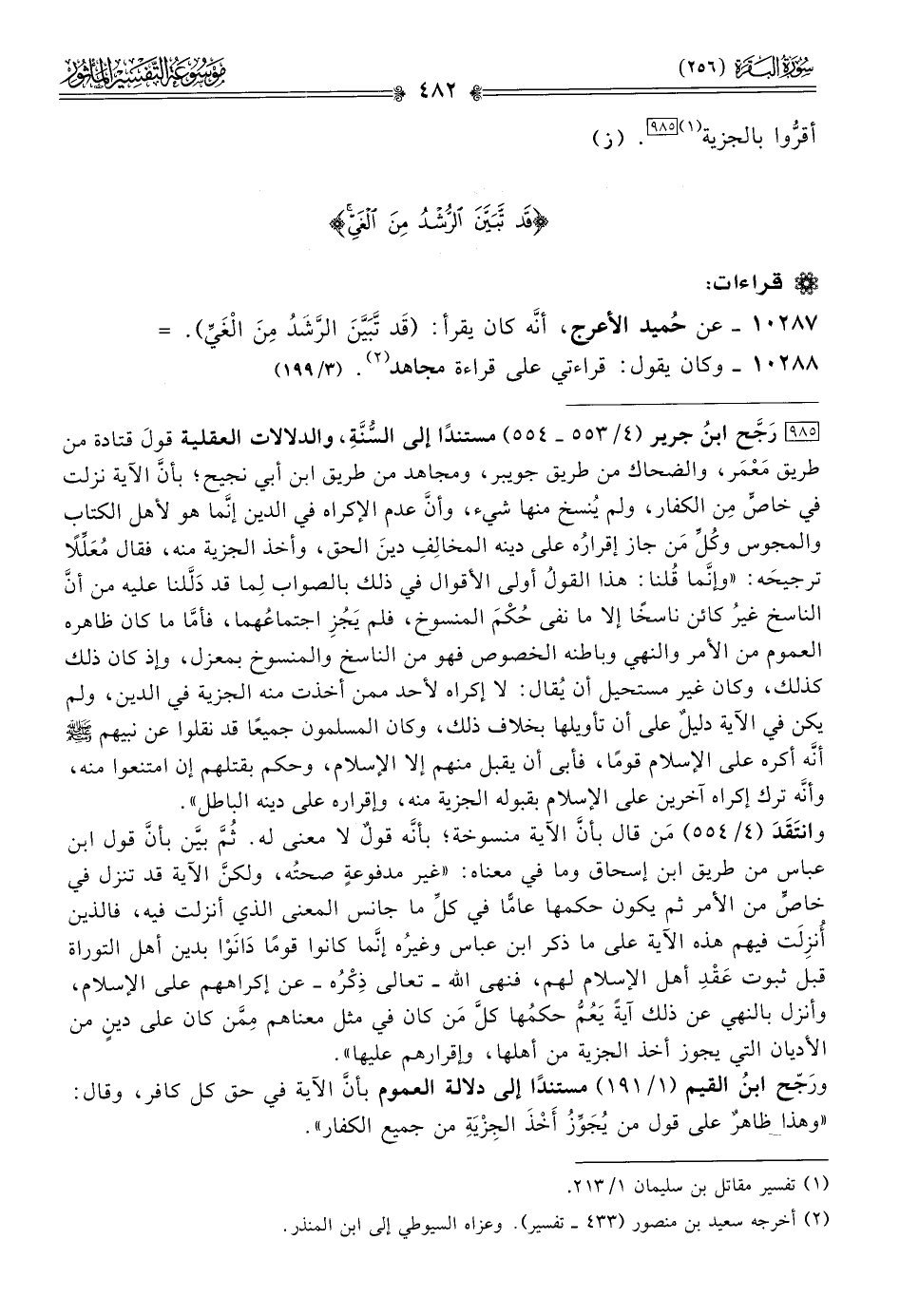 [٩٨٥] رَجَّح ابنُ جرير (٤/ ٥٥٣ - ٥٥٤) مستندًا إلى السّنَةِ، والدلالات العقلية قولَ قتادة من طريق مَعْمَر، والضحاك من طريق جويبر، ومجاهد من طريق ابن أبي نجيح؛ بأنّ الآية نزلت في خاصٍّ مِن الكفار، ولم يُنسخ منها شيء، وأنّ عدم الإكراه في الدين إنّما هو لأهل الكتاب والمجوس وكُلِّ مَن جاز إقرارُه على دينه المخالِفِ دينَ الحق، وأخذ الجزية منه، فقال مُعَلِّلًا ترجيحَه: «وإنّما قُلنا: هذا القولُ أولى الأقوال في ذلك بالصواب لِما قد دَلَّلنا عليه من أنّ الناسخ غيرُ كائن ناسخًا إلا ما نفى حُكْمَ المنسوخ، فلم يَجُزِ اجتماعُهما، فأمّا ما كان ظاهره العموم من الأمر والنهي وباطنه الخصوص فهو من الناسخ والمنسوخ بمعزل، وإذ كان ذلك كذلك، وكان غير مستحيل أن يُقال: لا إكراه لأحد ممن أخذت منه الجزية في الدين، ولم يكن في الآية دليلٌ على أن تأويلها بخلاف ذلك، وكان المسلمون جميعًا قد نقلوا عن نبيهم - صلى الله عليه وسلم - أنّه أكره على الإسلام قومًا، فأبى أن يقبل منهم إلا الإسلام، وحكم بقتلهم إن امتنعوا منه، وأنّه ترك إكراه آخرين على الإسلام بقبوله الجزية منه، وإقراره على دينه الباطل».