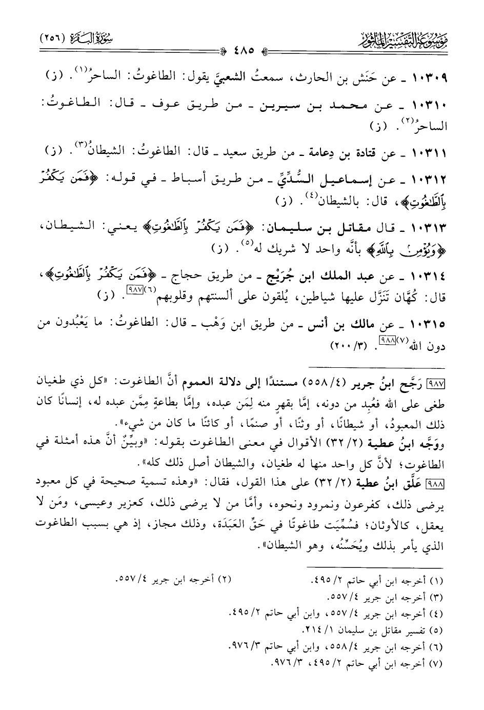 ١٠٣١٤ - عن عبد الملك ابن جُرَيْج -من طريق حجاج- {فمن يكفر بالطاغوت}، قال: كُهّان تَنَزَّل عليها شياطين، يُلقون على ألسنتهم وقلوبهم (¬٦) [٩٨٧]. (ز)