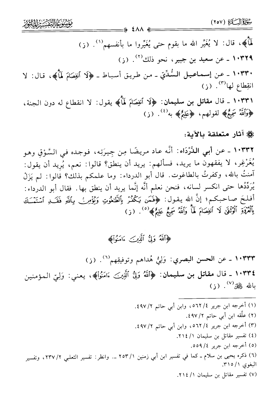 ١٠٣٣٤ - قال مقاتل بن سليمان: {الله ولي الذين آمنوا}، يعني: ولِيّ المؤمنين بالله - عز وجل - (¬٧). (ز)