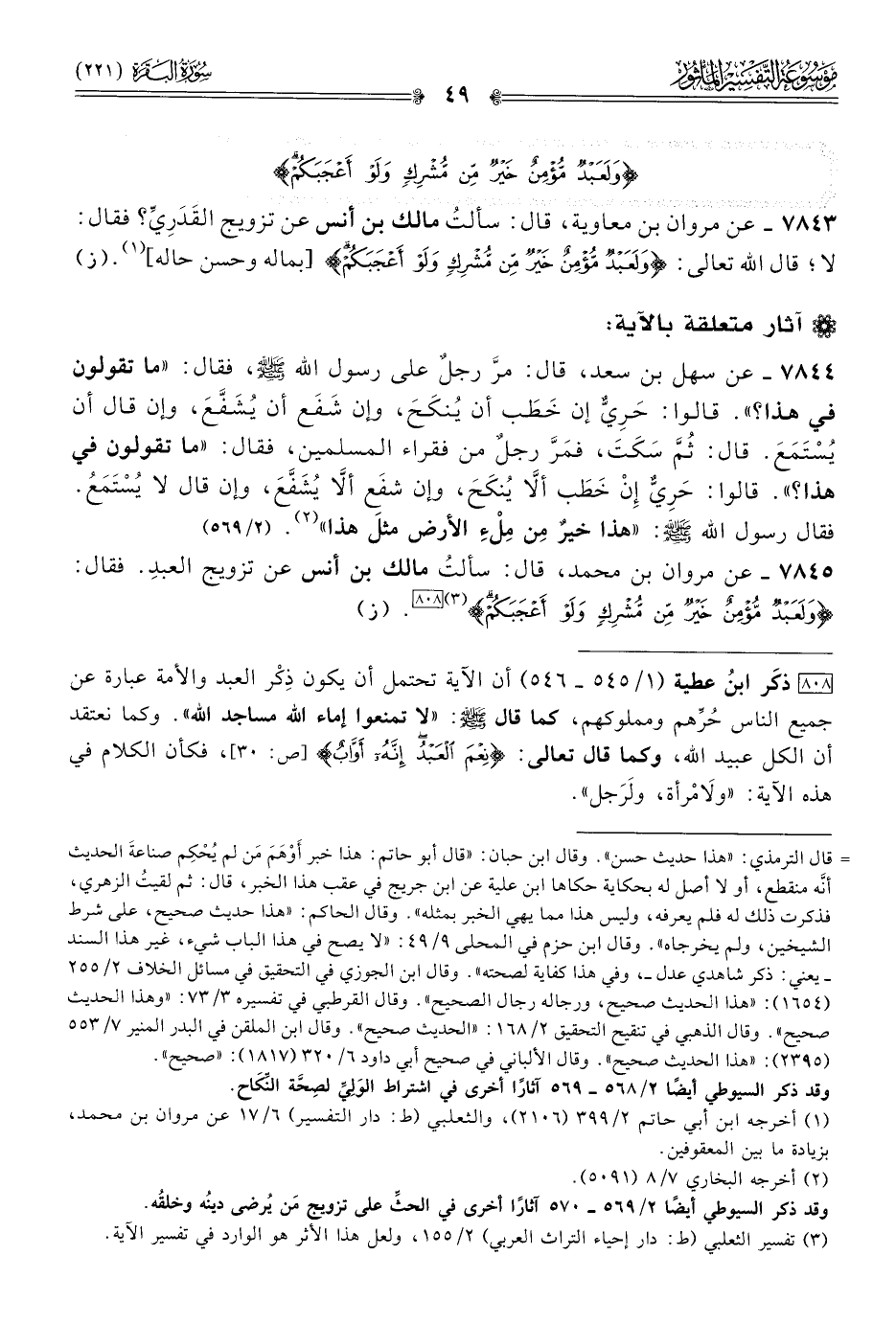 ٧٨٤٥ - عن مروان بن محمد، قال: سألتُ مالك بن أنس عن تزويج العبدِ. فقال: {ولعبد مؤمن خير من مشرك ولو أعجبكم} (¬٣) [٨٠٨]. (ز)