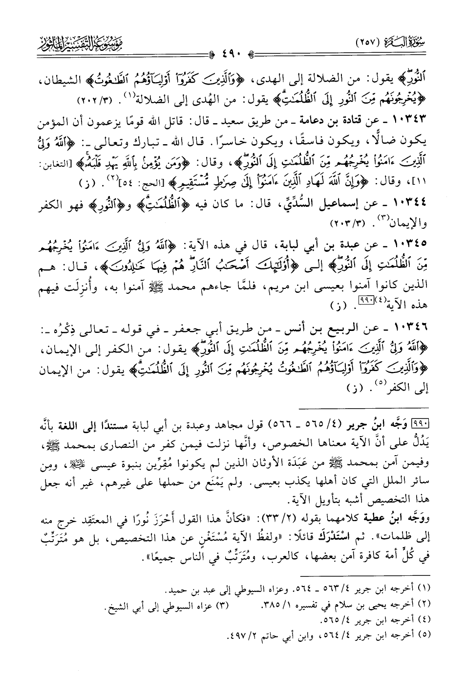 ١٠٣٤٥ - عن عبدة بن أبي لبابة، قال في هذه الآية: {الله ولي الذين آمنوا يخرجهم من الظلمات إلى النور} إلى {أولئك أصحاب النار هم فيها خالدون}، قال: هم الذين كانوا آمنوا بعيسى ابن مريم، فلمّا جاءهم محمد - صلى الله عليه وسلم - آمنوا به، وأُنزِلَت فيهم هذه الآية (¬٤) [٩٩٠]. (ز)