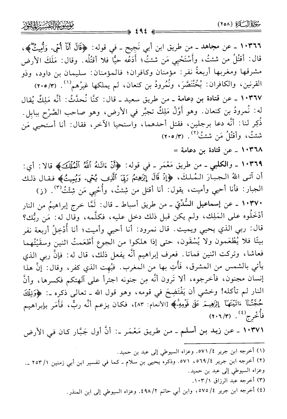 ١٠٣٧٠ - عن إسماعيل السُّدِّيّ -من طريق أسباط- قال: لَمّا خرج إبراهيمُ من النار أدْخَلُوه على المَلِك، ولم يكن قبل ذلك دخل عليه، فكلَّمه، وقال له: مَن ربُّك؟ قال: ربي الذي يحيي ويميت. قال نمرود: أنا أحيي وأميت؛ أنا أُدْخِلُ أربعة نفر بيتًا فلا يُطْعَمون ولا يُسْقَون، حتى إذا هلكوا من الجوع أطْعَمتُ اثنين وسقَيْتُهما فعاشا، وتركت اثنين فماتا. فعرف إبراهيم أنّه يفعل ذلك، قال له: فإنّ ربي الذي يأتي بالشمس من المشرق، فَأْتِ بها من المغرب. فبُهِت الذي كفر، وقال: إنّ هذا إنسان مجنون، فأخرجوه، ألا تَرون أنّه مِن جنونه اجترأ على آلهتكم فكسرها، وأنّ النار لم تأكله! وخشي أن يَفْتَضِحَ في قومه، وهو قول الله -تعالى ذكره-: {وتلك حجتنا آتيناها إبراهيم على قومه} [الأنعام: ٨٣]، فكان يزعم أنّه ربٌّ، فَأَمَر بإبراهيم فأُخْرِج (¬٤).