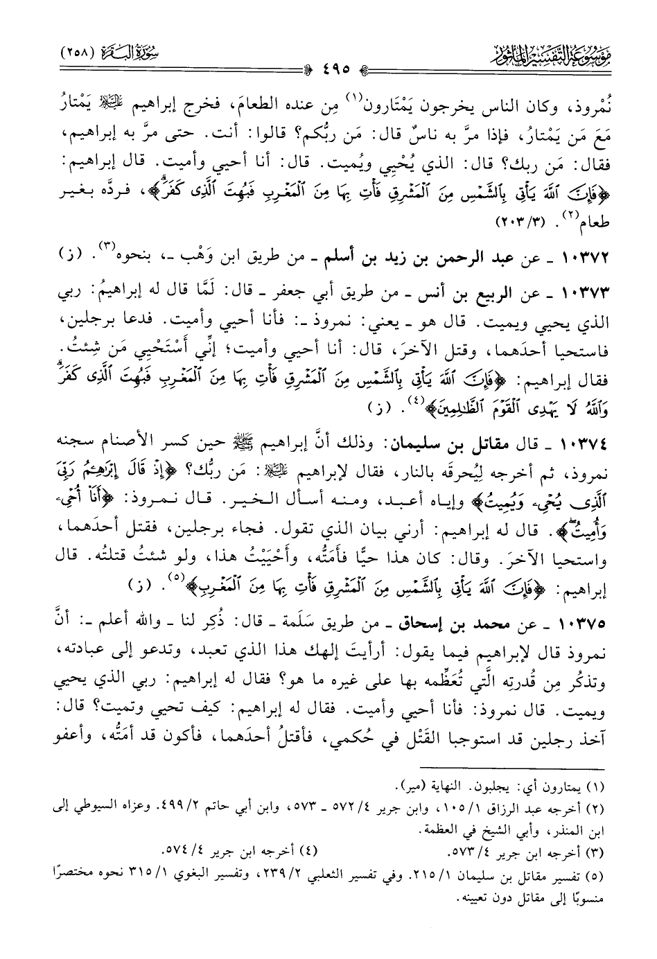 ١٠٣٧٤ - قال مقاتل بن سليمان: وذلك أنّ إبراهيم - صلى الله عليه وسلم - حين كسر الأصنام سجنه نمروذ، ثم أخرجه لِيُحرقَه بالنار، فقال لإبراهيم - عليه السلام -: مَن ربُّك؟ {إذ قال إبراهيم ربي الذي يحيي ويميت} وإياه أعبد، ومنه أسأل الخير. قال نمروذ: {أنا أحيي وأميت}. قال له إبراهيم: أرني بيان الذي تقول. فجاء برجلين، فقتل أحدَهما، واستحيا الآخرَ. وقال: كان هذا حيًّا فأَمَتُّه، وأَحْيَيْتُ هذا، ولو شئتُ قتلتُه. قال إبراهيم: {فإن الله يأتي بالشمس من المشرق فأت بها من المغرب} (¬٥). (ز)