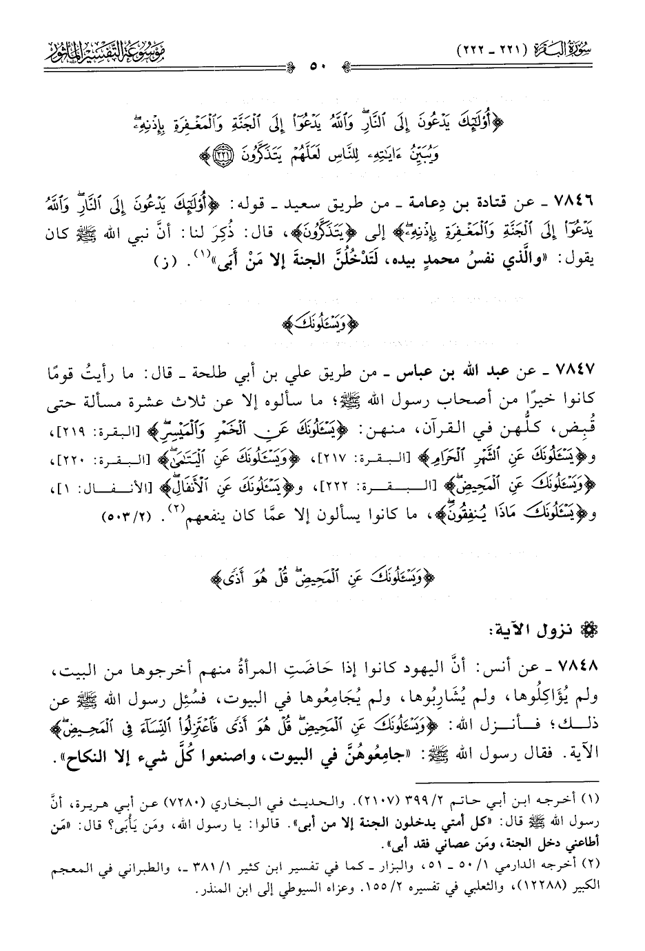 ٧٨٤٨ - عن أنس: أنّ اليهود كانوا إذا حاضَتِ المرأةُ منهم أخرجوها من البيت، ولم يُؤاكِلُوها، ولم يُشارِبُوها، ولم يُجامِعُوها في البيوت، فسُئِل رسول الله - صلى الله عليه وسلم - عن ذلك؛ فأنزل الله: {ويسألونك عن المحيض قل هو أذى فاعتزلوا النساء في المحيض} الآية. فقال رسول الله - صلى الله عليه وسلم -: «جامِعُوهُنَّ في البيوت، واصنعوا كُلَّ شيء إلا النكاح».